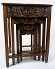 Each table is beautifully decorated with different motifs that tell stories from the culture and traditions of the Far East. These intricately carved details add depth and character to each table, making them both practical pieces of furniture and works of art in their own right.