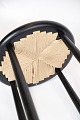 Stolens ramme er fremstillet af sort lakeret træ, der giver den et slankt og stilfuldt udseende. Sædet er flettet, hvilket tilføjer tekstur og varme til det overordnede design. Denne kombination af materialer og konstruktion resulterer i en barstol, der både er holdbar og behagelig at sidde på.