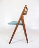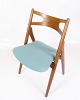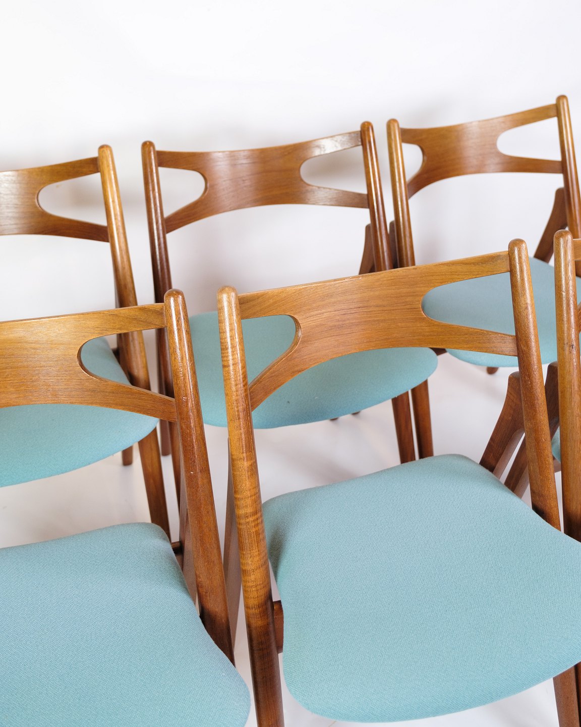This set of six dining room chairs, model CH29P, is made of teak wood and has a timeless elegance that fits perfectly in any dining area. The chairs are carefully upholstered in light blue fabric that adds a pleasant contrast to the warm wood.