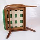 Stolen er betrukket med grønt stof, som giver en frisk og behagelig kontrast til teaktræets varme farver. Det grønne stof tilføjer en pop af farve, samtidig med at det opretholder et klassisk og tidløst look. Stoffet er valgt for sin komfort og holdbarhed, hvilket sikrer, at stolen ikke kun ser godt ud, men også er behagelig at sidde i.