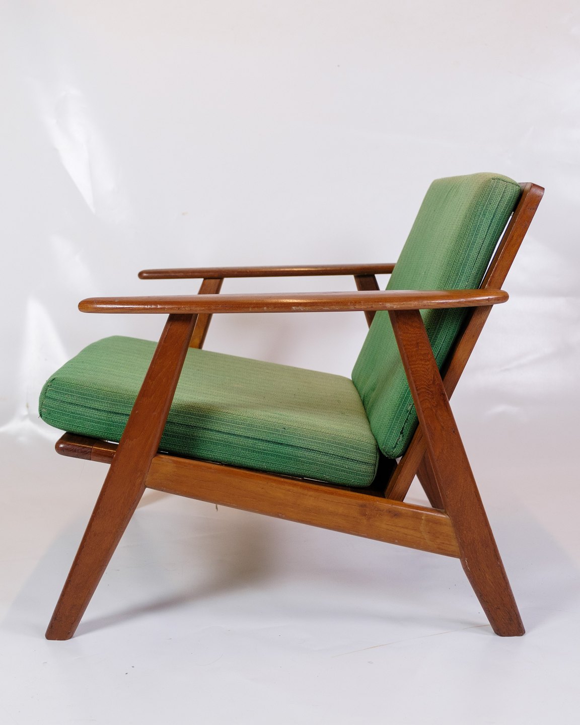 Denne lænestol fra 1960'erne er et fremragende eksempel på dansk design fra midten af det 20. århundrede. Stolen er fremstillet af teaktræ og betrukket med grønt stof, hvilket kombinerer naturlige materialer med tidens farvetrends.
