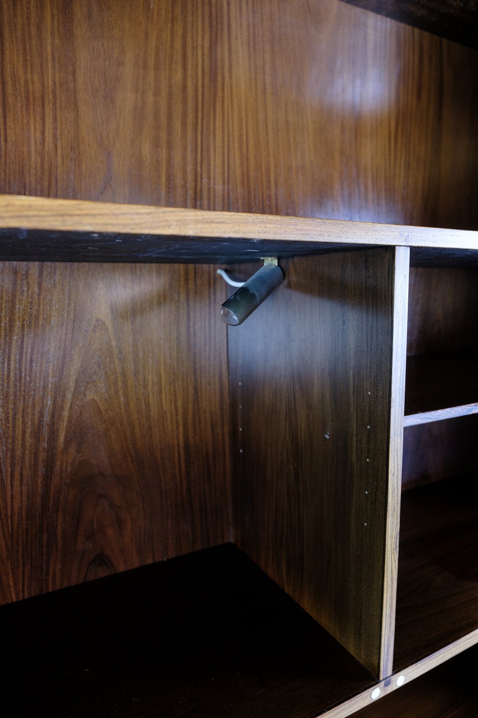 This bookcase with a light display, made from rosewood and showcasing Danish design from the 1960s, is a superb example of mid-century modern furniture. The piece combines functionality with elegance, making it a stylish and practical addition to any home.