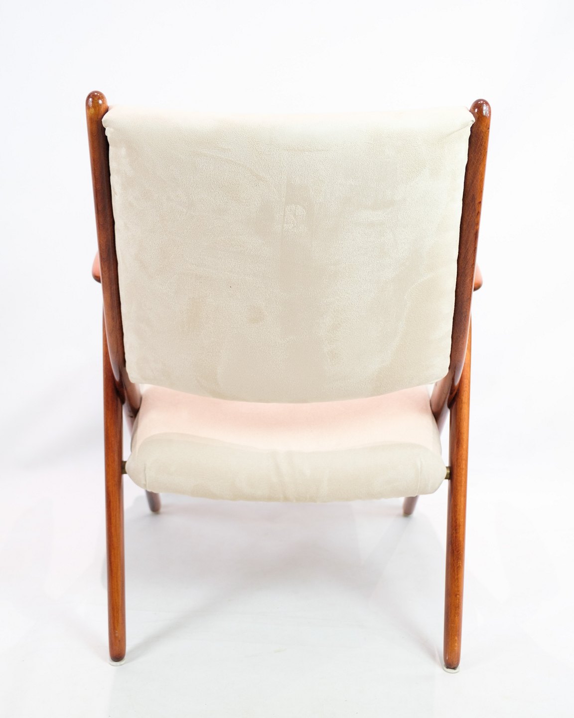 Armchair made of polished dark wood upholstered with light fabric of the best quality. The chair was designed by a Danish designer named Arne Hovmand-Olsen from the 1960s. Arne Hovmand-Olsen was a Danish furniture architect and in 1938 apprenticed with P. Olsen Siabast before he began designing his own chairs with great success in the early 1950s. Han chairs are today highly sought after both nationally and internationally.