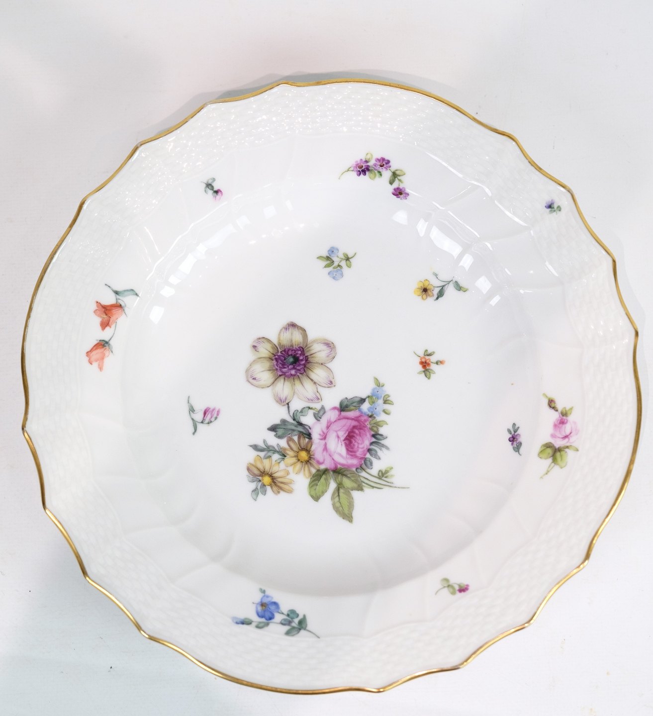 Royal porcelain dinner plates with patterned Saxon flower decorated on the edge with gold. Manufactured by Royal Copenhagen in approx. 1923, where all their goods have been hand painted and subsequently become very rare. The plates are free of flaws or defects.