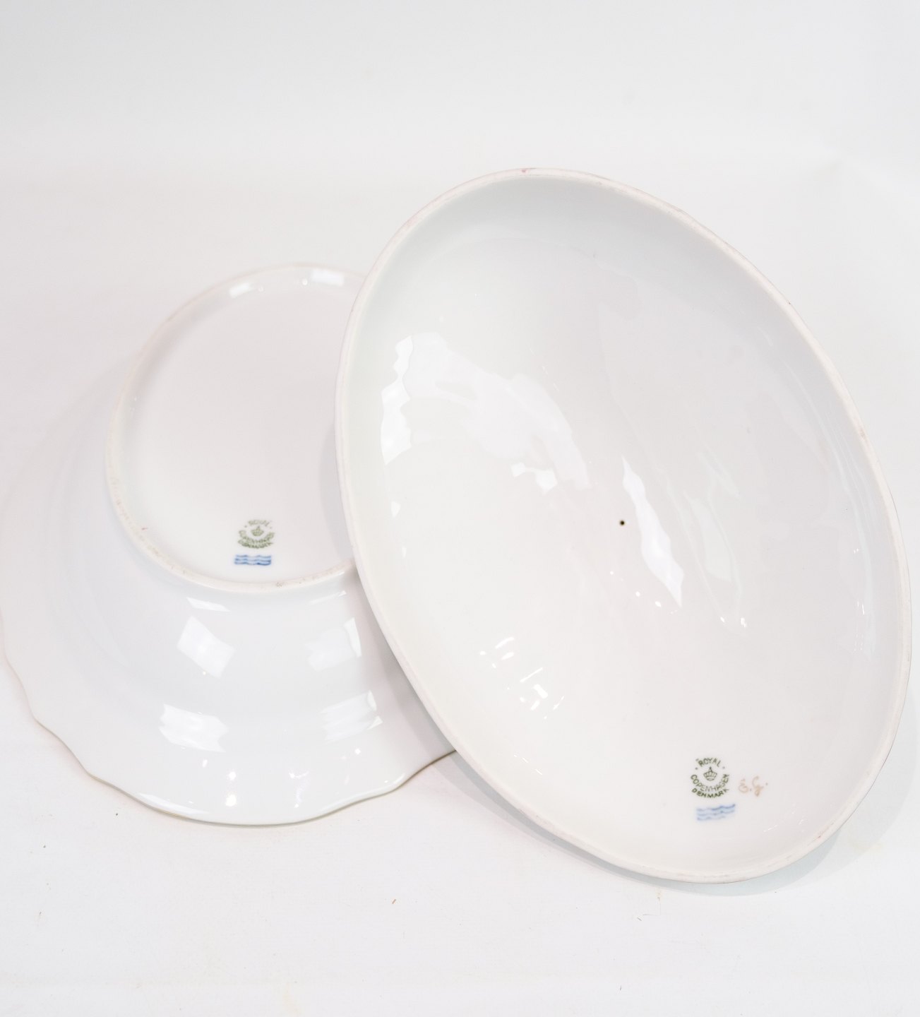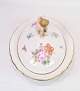 Stort Låg Fad dekoreret med en "Putti" siddende på låget lavet af Kongelig porcelæn med mønstret Saksisk blomst dekoreret i kanterne med guld. Fremstillet af Royal Copenhagen i ca. 1923, hvor alle deres varer er blevet håndmalet og efterfølgende blevet meget sjældne. Fadet står uden mangler eller defekter.
