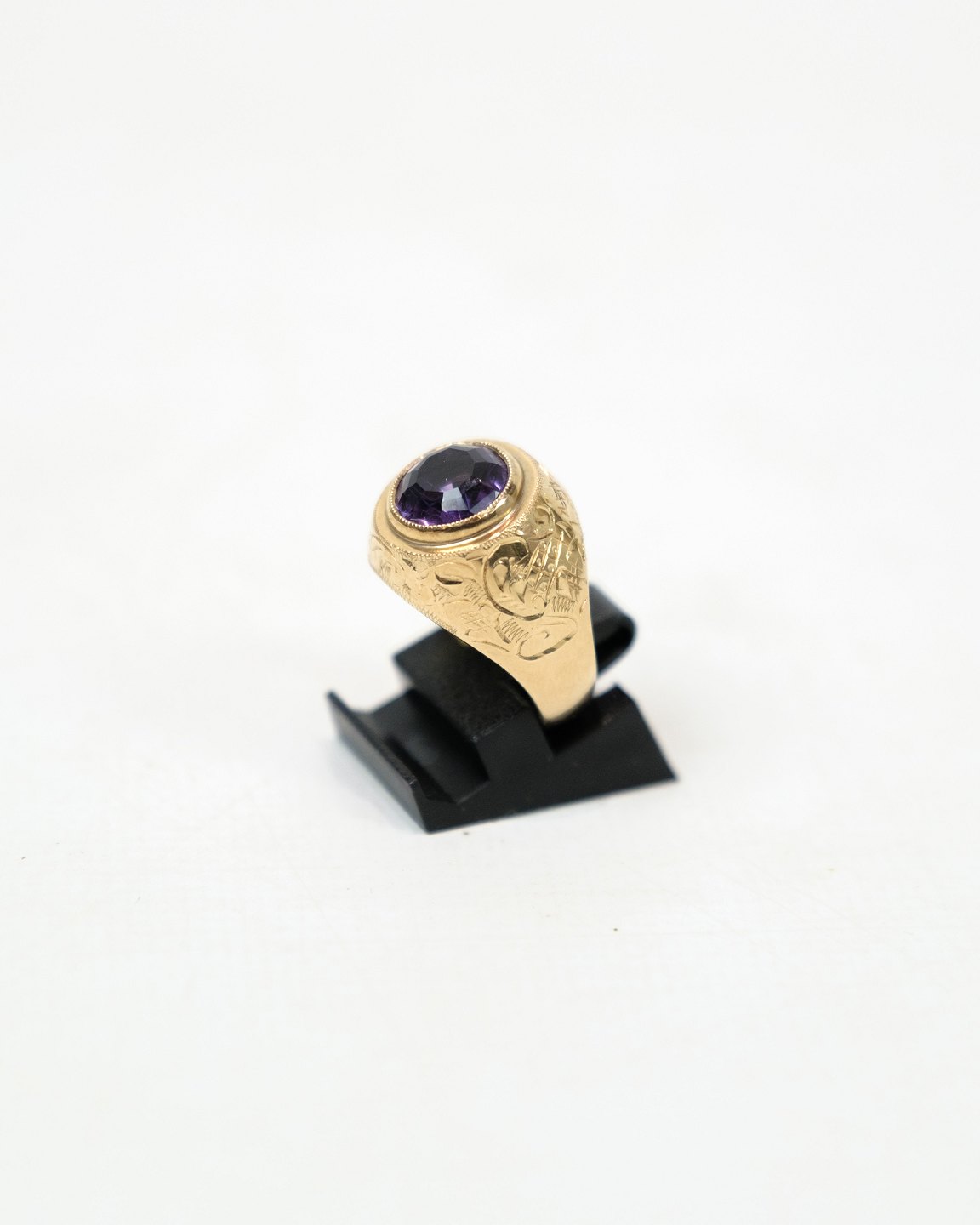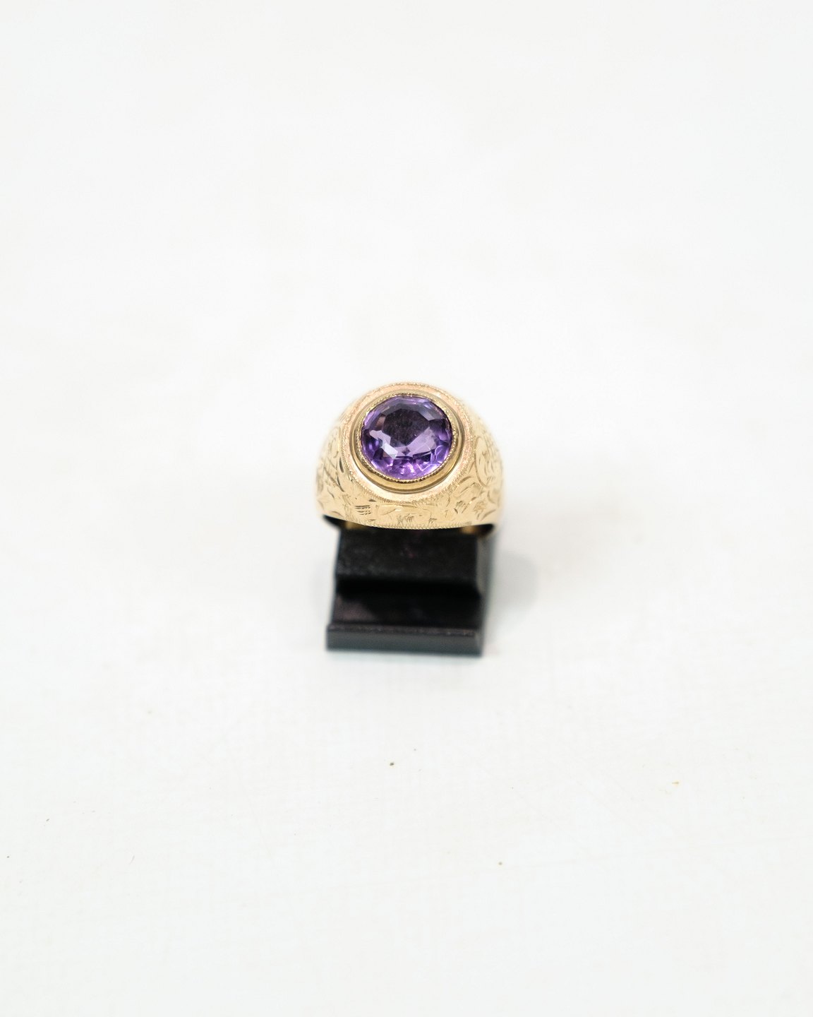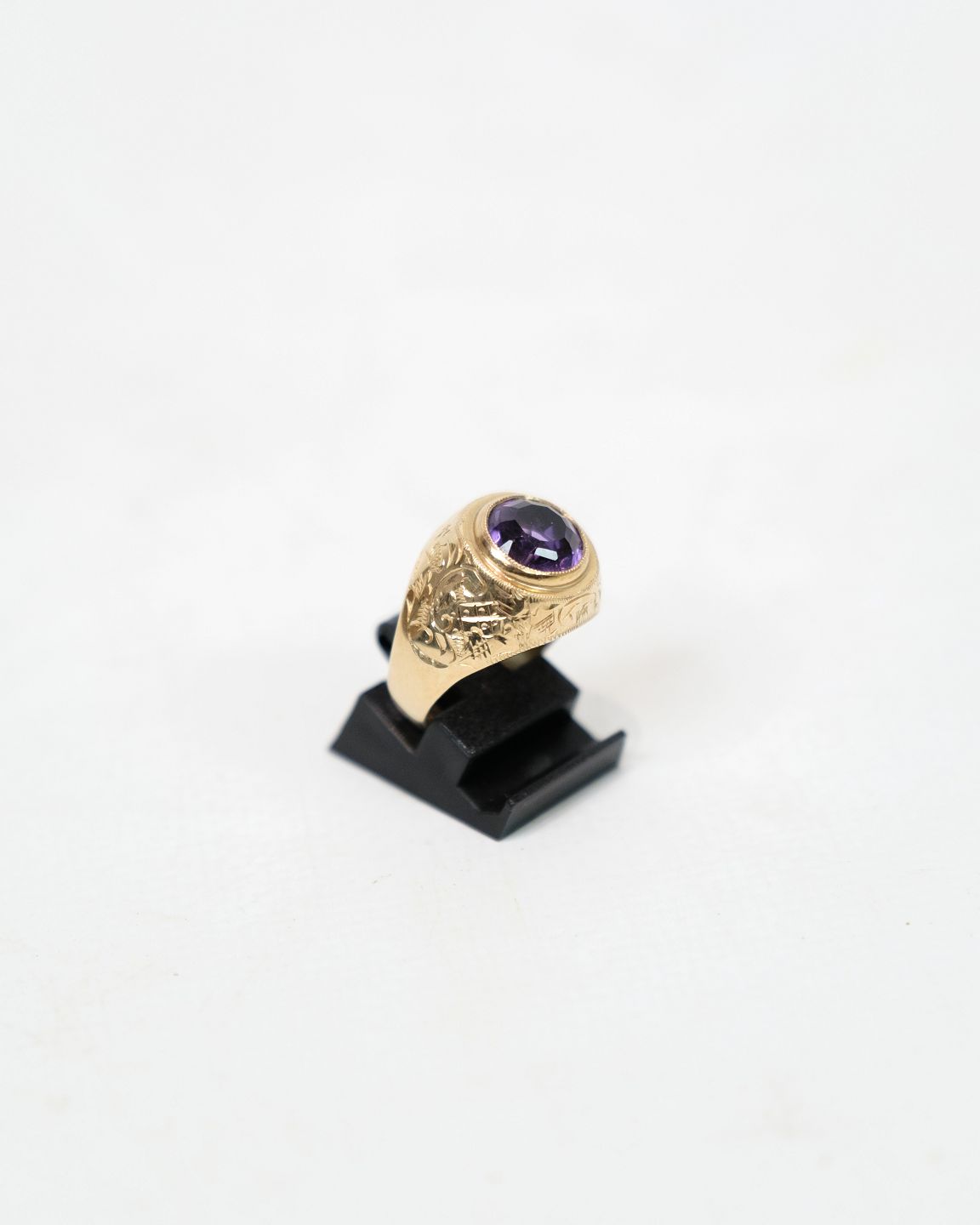 This ring is made of 14 carat gold and decorated with a beautiful amethyst. The ring is stamped with CHRISTMAS. Amethyst is known for its beautiful and rich purple hues and is a popular gemstone.