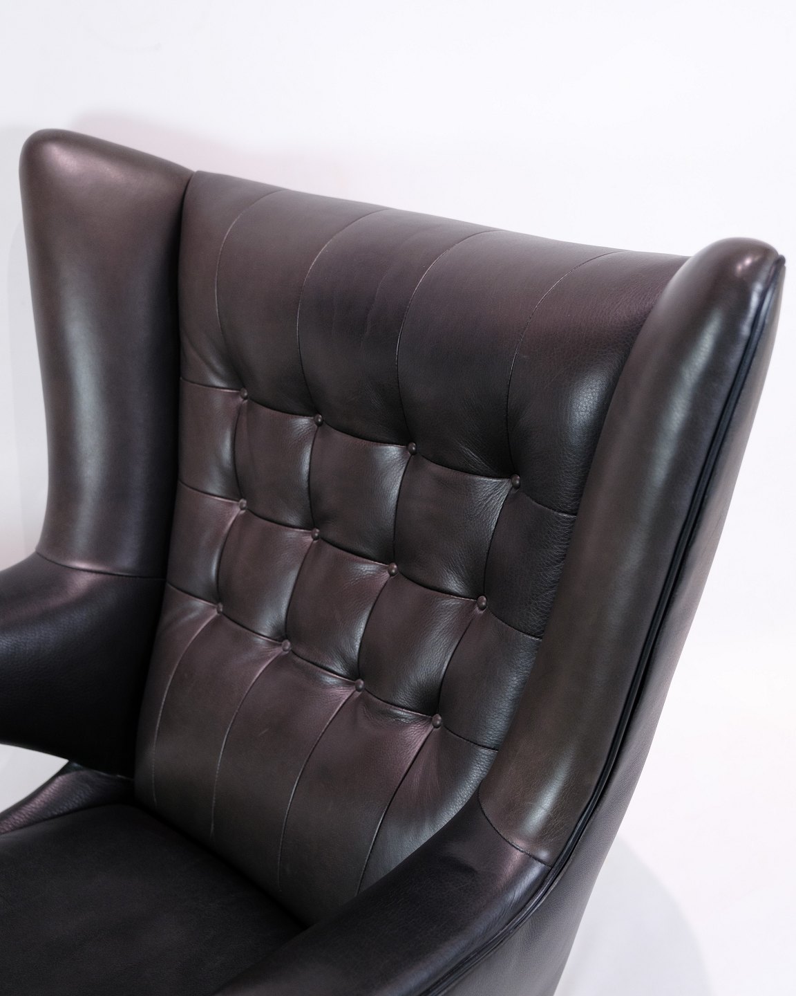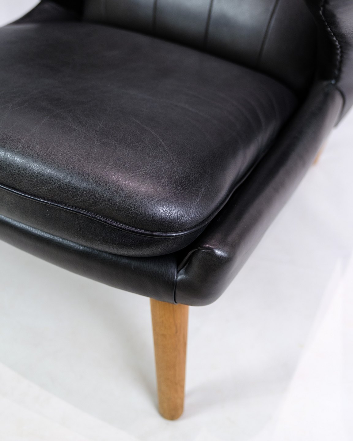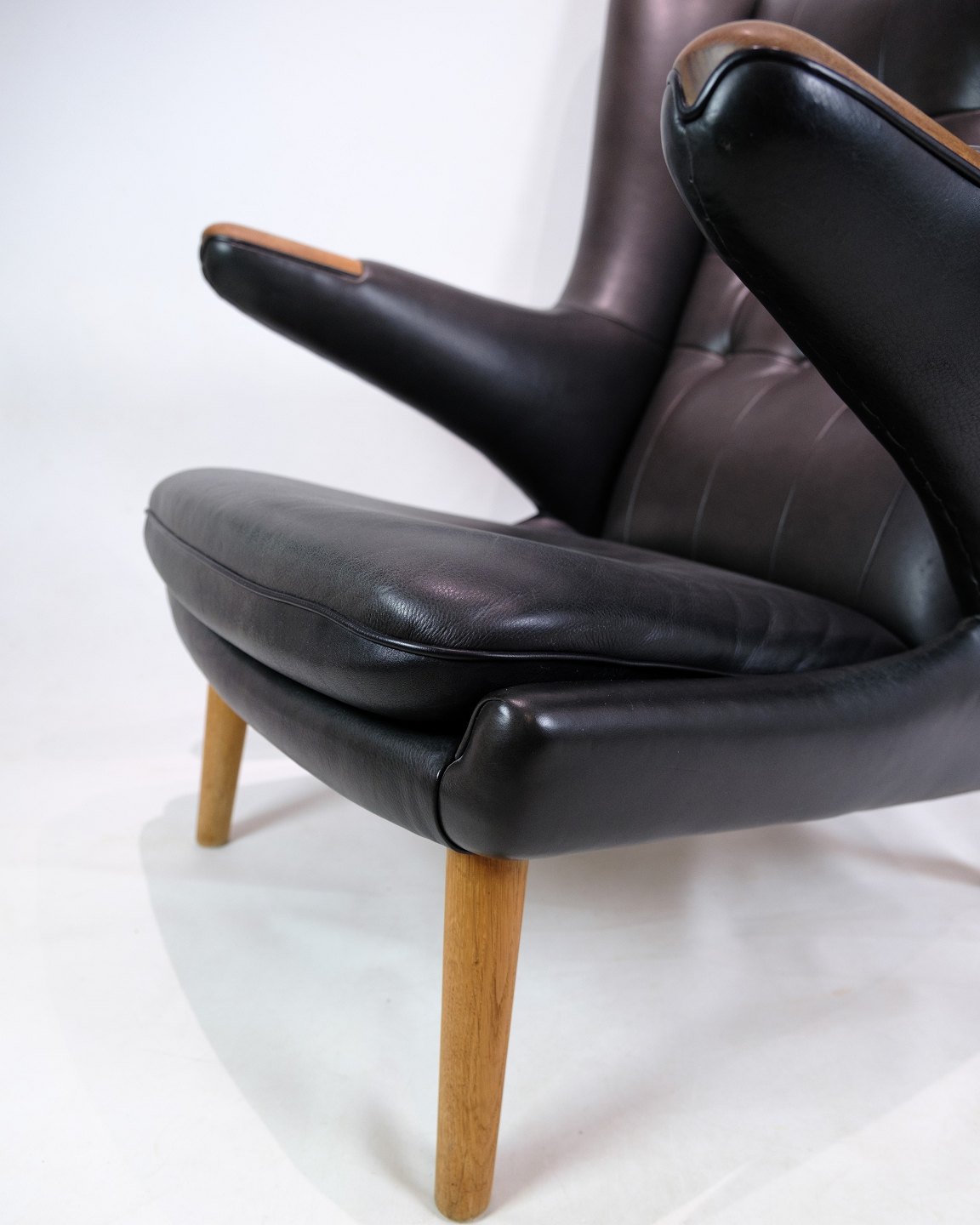 SolgtLænestolen, Model AP 19 også kendt som "Bamsestolen", designet af Hans J. Wegner i 1951 og fremstillet af P.P Møbler, er et ikon inden for dansk design. Stolen er betrukket med luksuriøst sort læder, hvilket sikrer både komfort og et stilfuldt udtryk. Armlænene, kendt som "neglen," er lavet af teaktræ, mens benene er udført i solidt egetræ, hvilket giver en smuk kontrast og holdbarhed.
