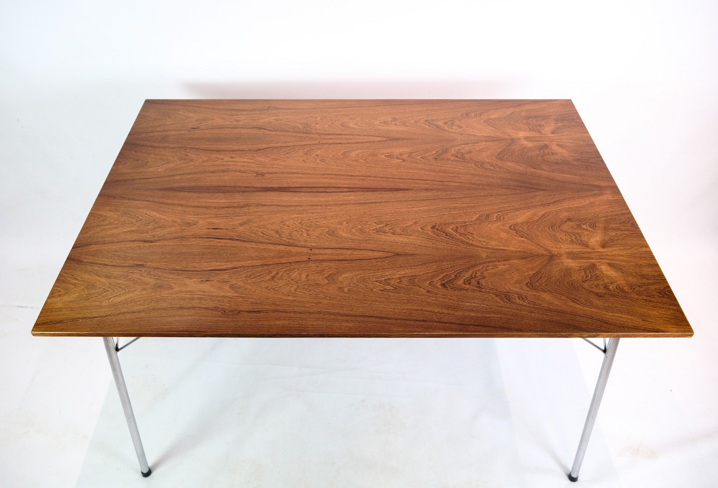 Spisebord/cafebord i palisander med forkromet stålstel, designet af Arne Jacobsen for Fritz Hansen i 1960'erne. Bordet er fremstillet med fokus på både æstetik og funktionalitet, hvor de eksklusive materialer mødes i et stilrent design. Arne Jacobsen er kendt for sine banebrydende og funktionelle designs, mens Fritz Hansen er anerkendt for deres høje kvalitet og håndværk.