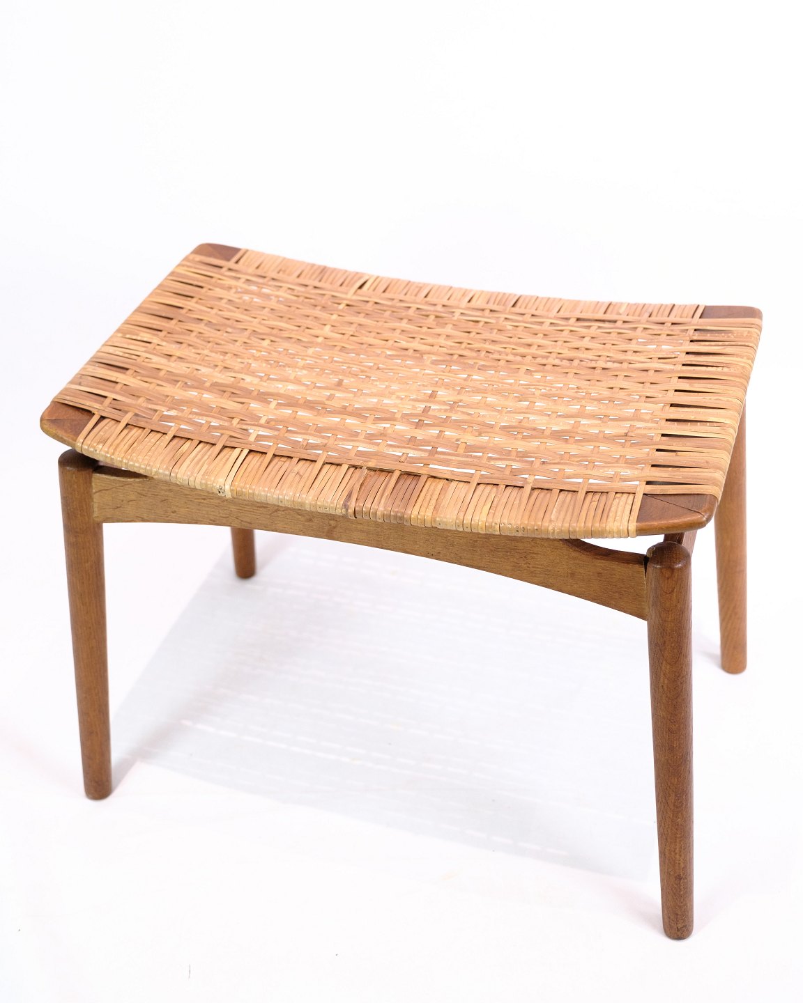 Stool in oak with caning, designed by Sigfred Omann for Ølholm Møbelfabrik in the 1960s. The stool combines solid wood with a hand-woven seat, which gives it both strength and elegance. Sigfred Omann is known for his quality designs and, in collaboration with Ølholm Møbelfabrik, a recognized producer of Danish furniture craftsmanship, created this stool.