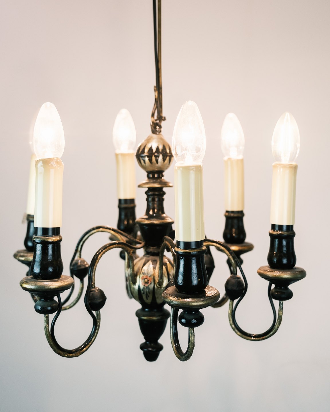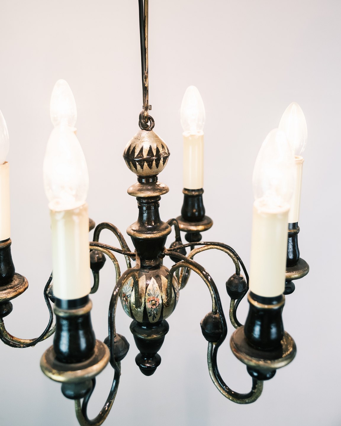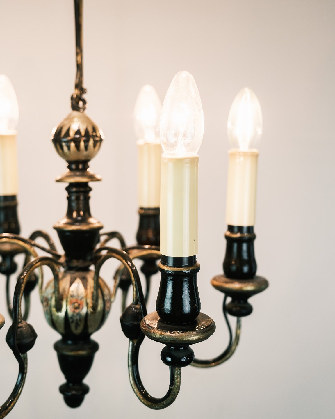 Church crown with 6 arms, made of wood and decorated with gold, from the 1930s. This chandelier combines classic craftsmanship with religious symbolism and period style, making it an impressive and historic piece.