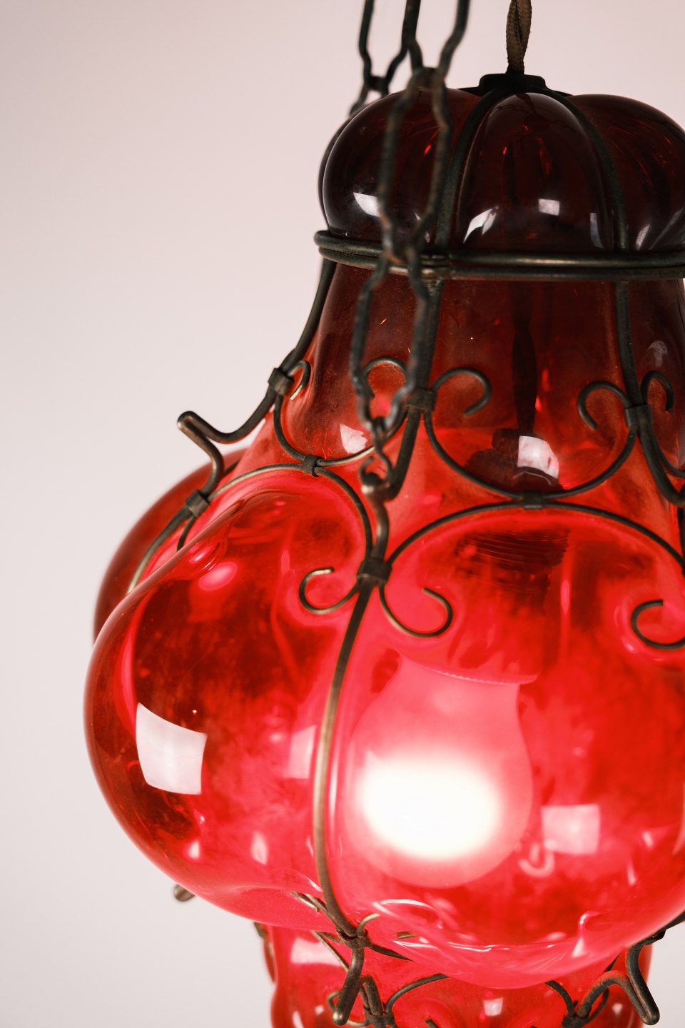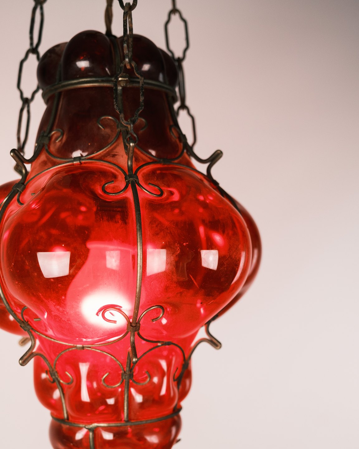 Lamp/Grid Pendant - Ruby Red Glass - Venetian Style - 1950s