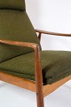 Alf Svensson, en anerkendt designer, har skabt disse lænestole med en elegant ramme i teaktræ, der harmonerer smukt med det grønne stofbetræk.