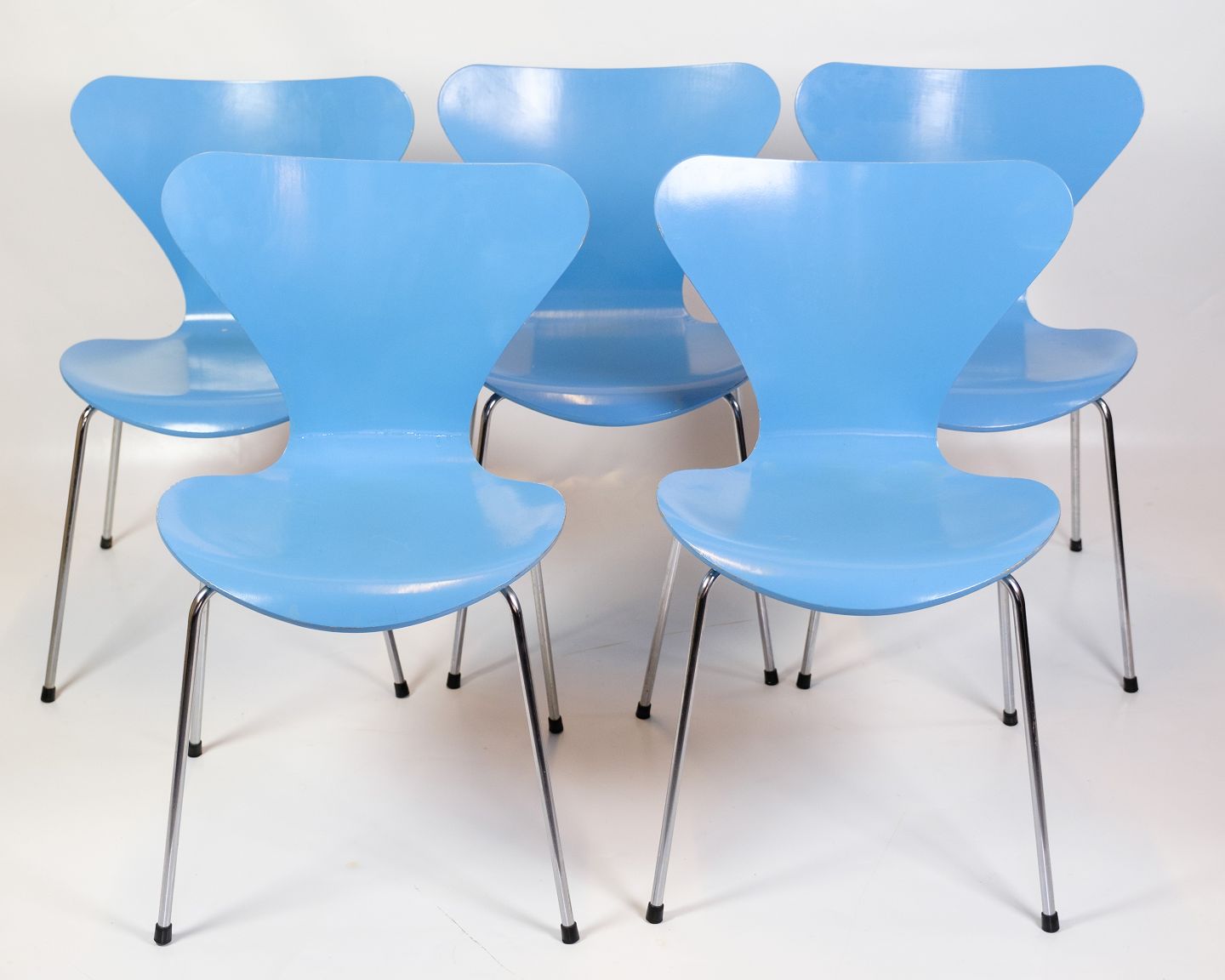 Set of 5 dining chairs, model 3107, also known as the "Syver chair", designed by Arne Jacobsen and produced by Fritz Hansen in the 1980s. The chairs are lacquered in a light blue colour, which gives them an elegant and timeless look. The Seven chair is known for its comfortable and iconic shape, which combines functionality with a stylish design.