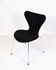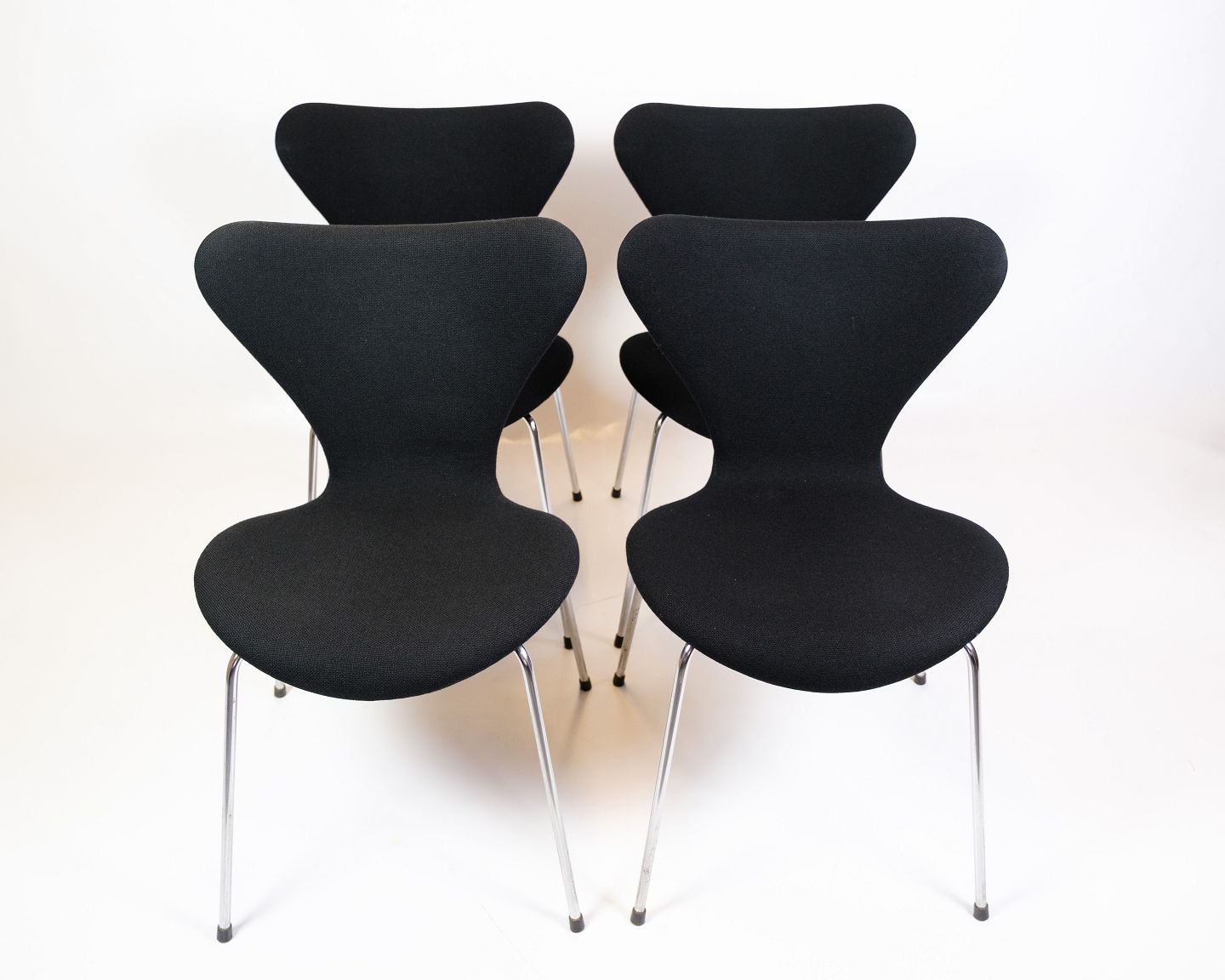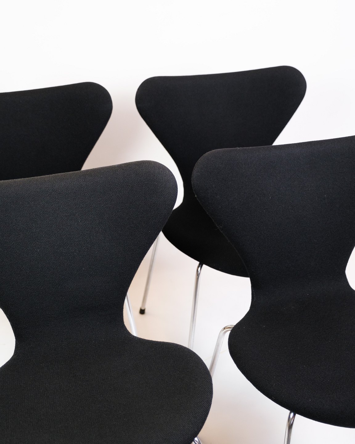 Set of 4 dining chairs, model 3107, also known as the "Seven Chair", designed by Arne Jacobsen and produced by Fritz Hansen. The chairs are originally upholstered in black fabric. The Syver chair is known for its comfortable and iconic shape, which combines functionality with a stylish design.