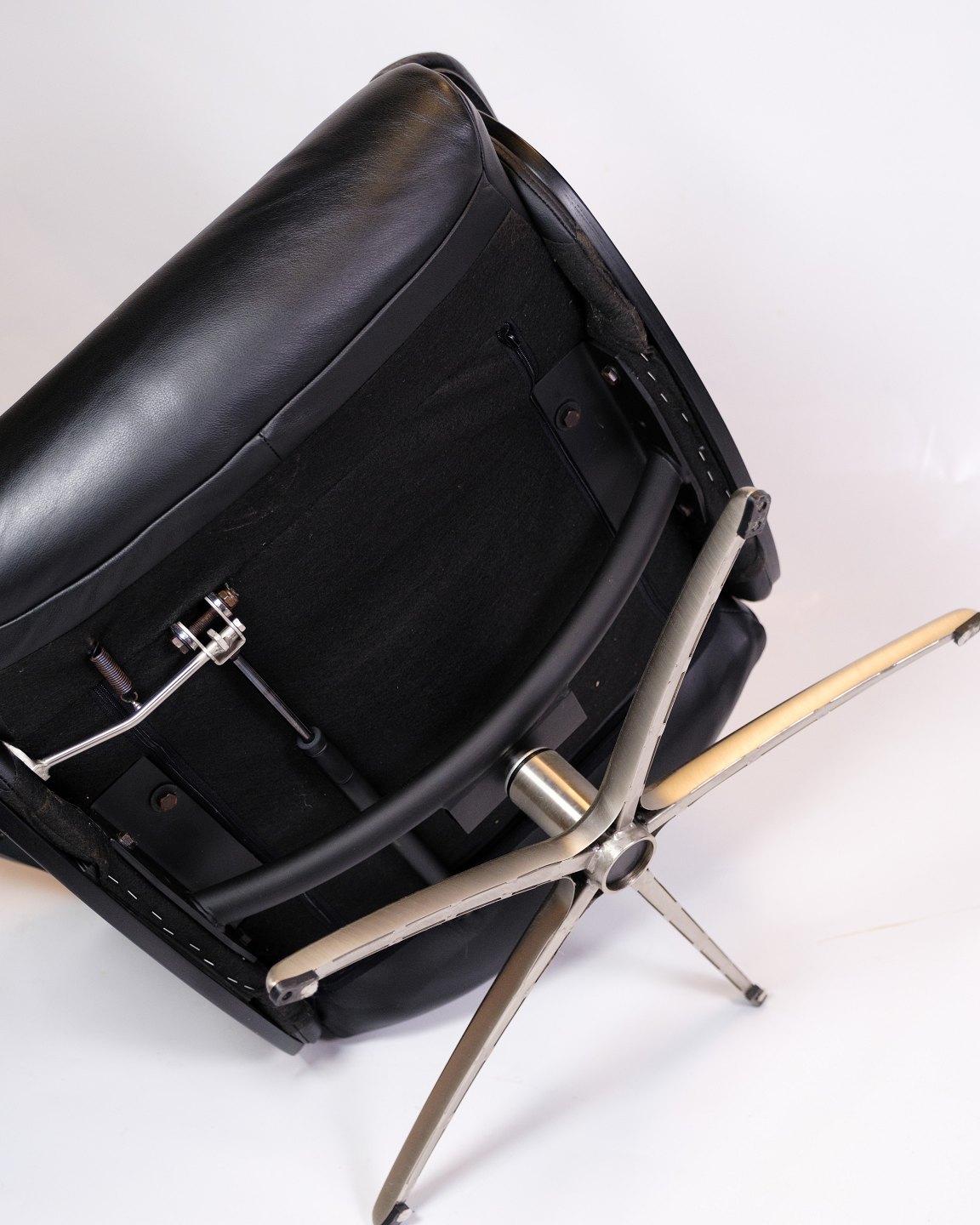 Lænestol betrukket i sort læder med drejefod af aluminium fra 1970'erne.