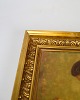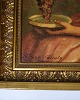 Oil painting framed in a gilded wooden frame with a motif of a little girl holding a bunch of grapes. Painted in warm colors. Signed.