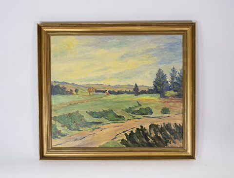 Oil painting framed in a gilded wooden frame with motif forest landscape in warm colors signed by Kai Drews from the 1930s