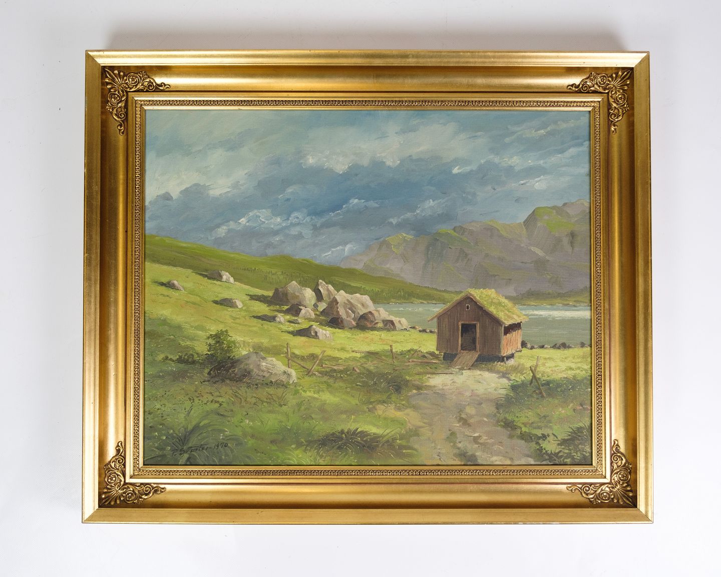 Oil painting framed in a gilded wooden frame with the motif of a cabin out in a mountain landscape. Signed by P. Svarter from the 1970s