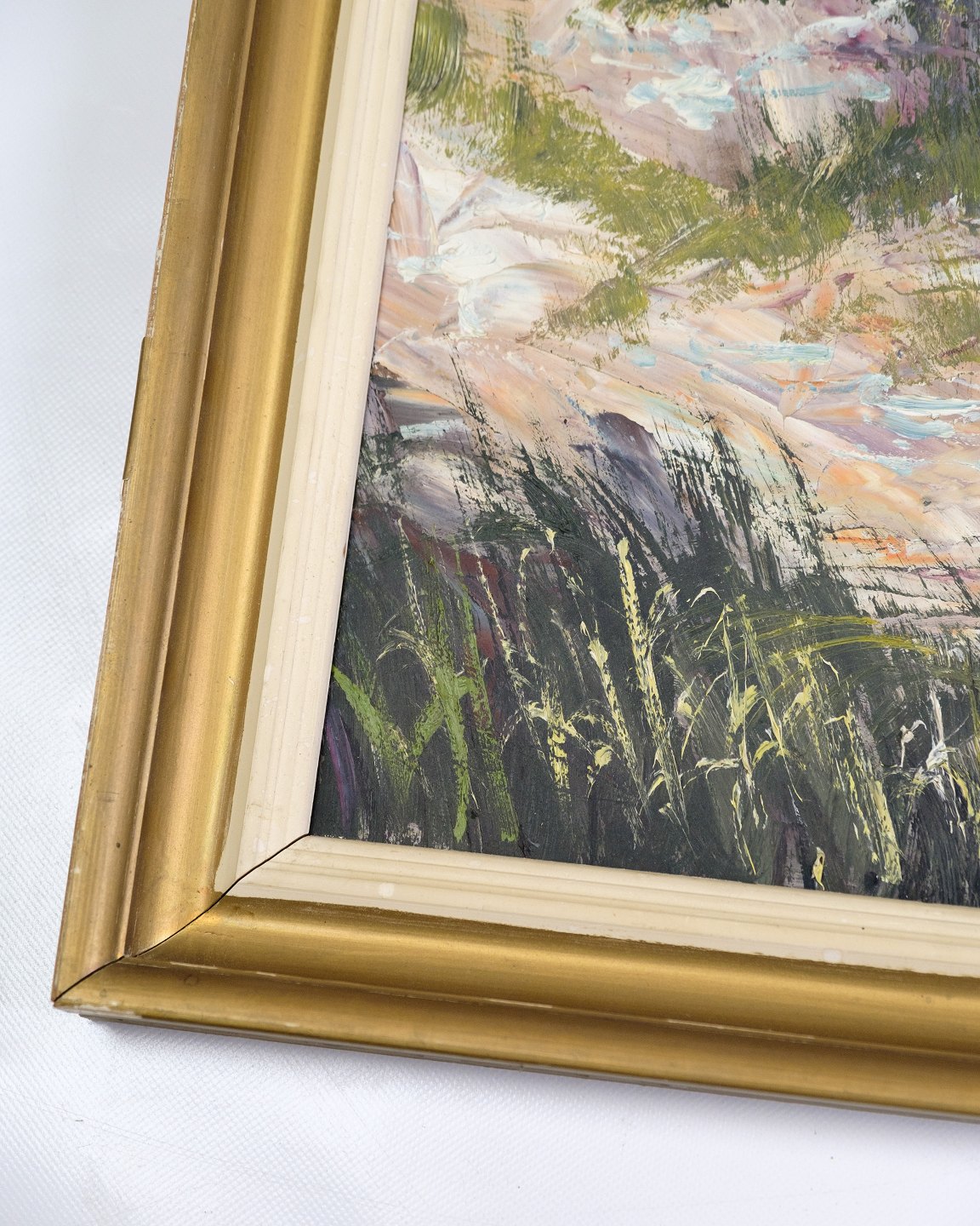 Oliemaleri med motiv af kysten, sandklitterne og havet i baggrunden i blæsevejr med en mørkeblå himmel. I en forgyldt ramme og signeret af Poul Fureby.