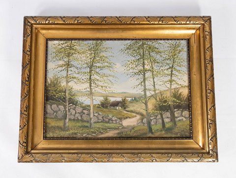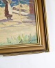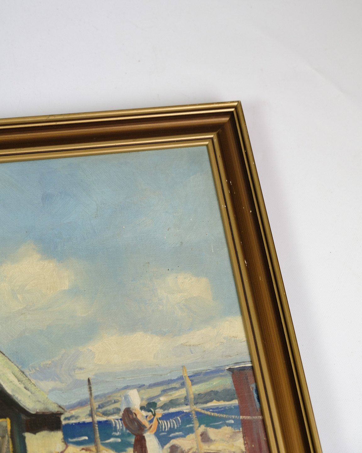 Oliemaleri med motiv af en fiskerkone, der hænger ting til tørre. I baggrunden ses et lille hus med et skur ved siden af, og kysten kan skimtes bagved huset. I forgrunden står en båd, der tilfører billedet en autentisk kyststemning.