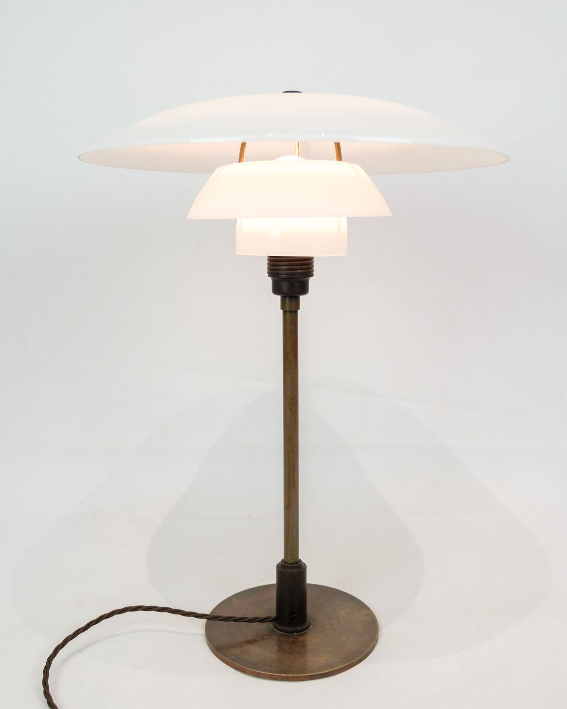 Bordlampe, PH 4/2½, designet af Poul Henningsen og fremstillet af Louis Poulsen i 1930'erne. Lampen er udført med hvide opal glasskærme og et stel af bruneret messing, som giver en klassisk kombination af funktion og elegance. PH-lamperne er kendt for deres unikke design, hvor skærmene er skabt til at sprede lyset jævnt og blødt.