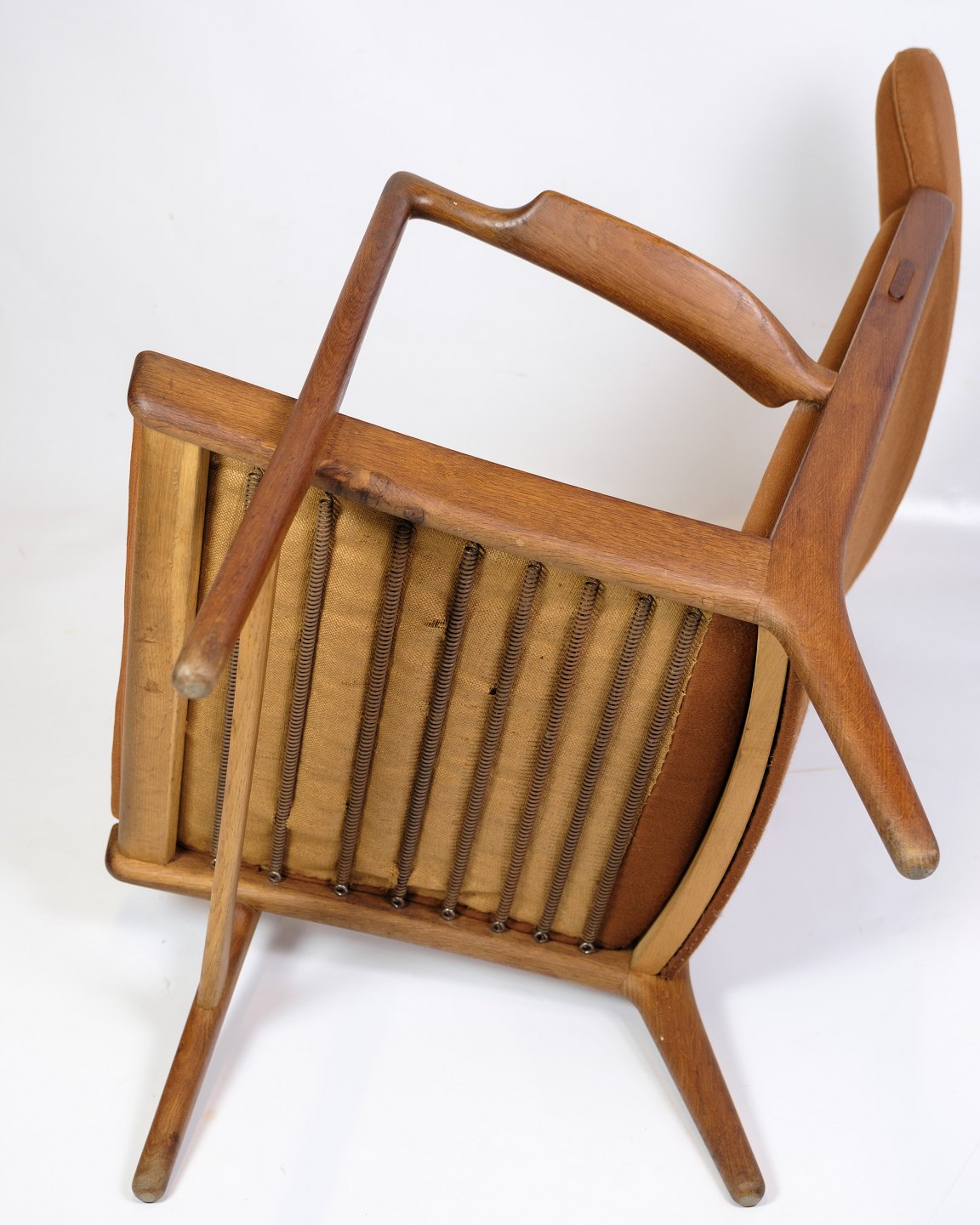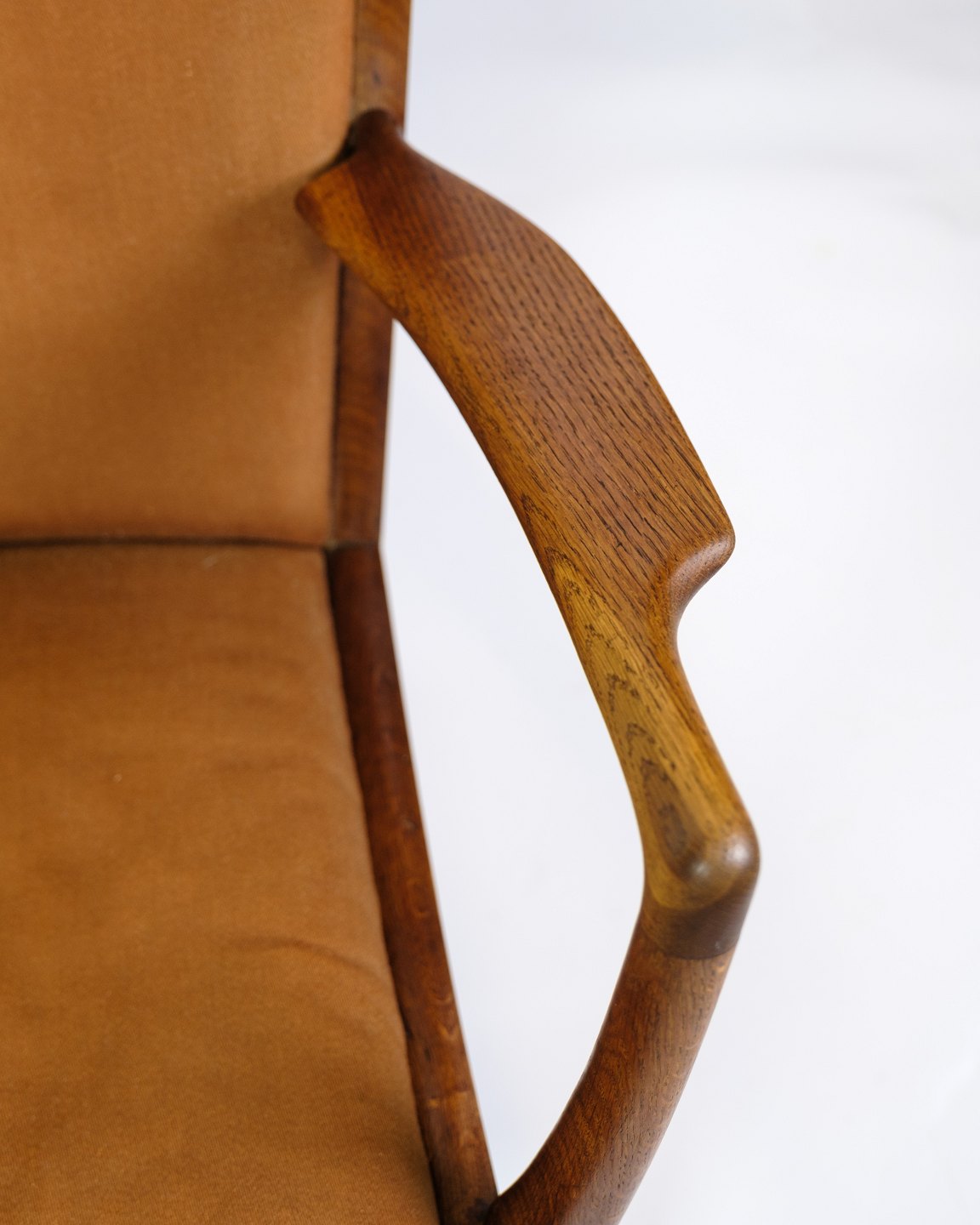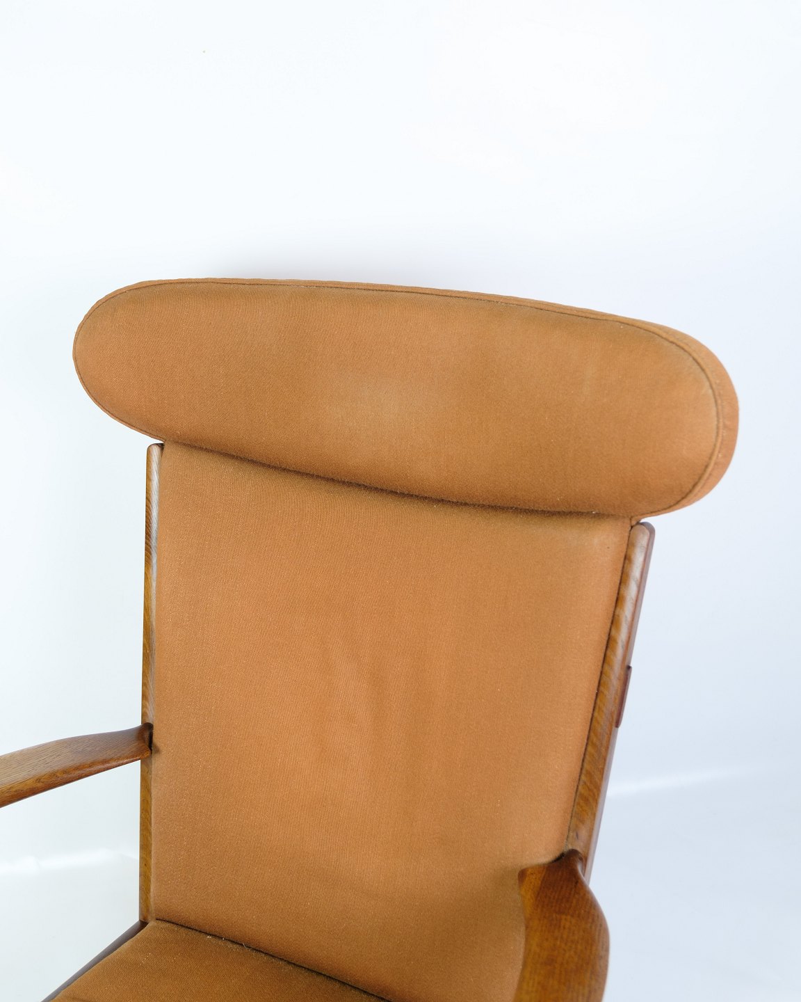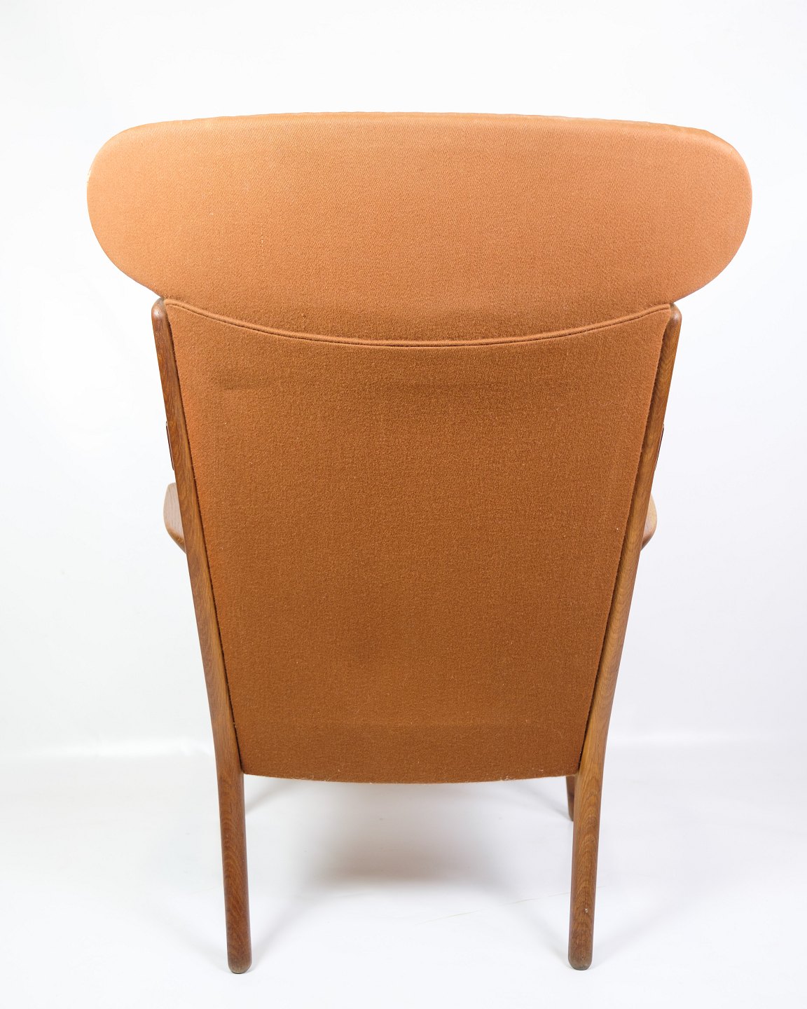 Kontakt os vedrørende prisLænestolen model AP 15, designet af Hans J. Wegner og produceret af AP Stolen i 1951, er udført i egetræ og polstret med orange stof. Stolen er kendt for sin høje ryg og buede armlæn, der giver både komfort og et elegant udtryk.