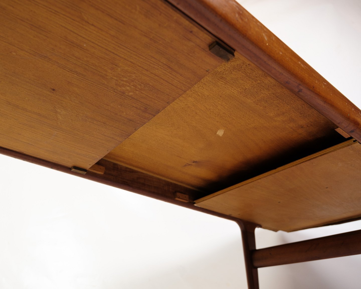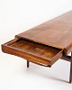 Sofabord i teak med indbyggede skuffer, designet af Johannes Andersen og fremstillet af Uldum Møbelfabrik i 1960'erne. Bordet kombinerer funktionalitet og praktiske opbevaringsmuligheder i form af de indbyggede skuffer. Teaktræet giver bordet en varm og naturlig farvetone, typisk for dansk design i perioden.
