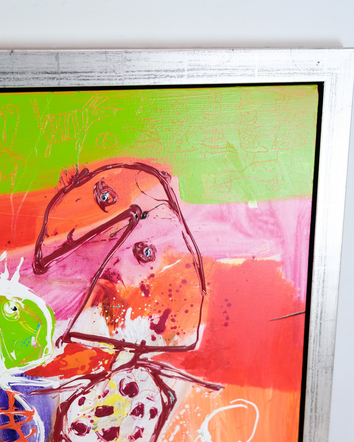 This oil painting was created by Danish artist Finn Sørensen in 2006 and is titled "Family Idyll". The painting is characterized by Sørensen's expressive and playful style, with colorful figures and a dynamic composition that invites interpretation. The bright, contrasting colors and naive shapes create a strong visual narrative, where the motif oozes life and energy. The work is framed in a silver-colored frame that highlights the painting's intense color palette. A unique and eye-catching piece of art that will add personality to any room.