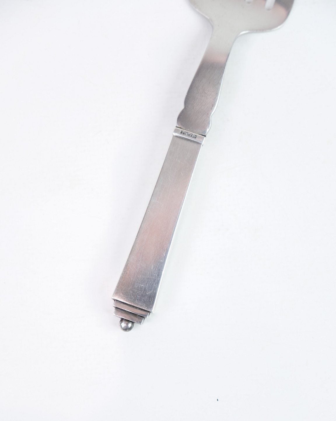 The herring fork in sterling silver, combined with steel, model 216. The herring fork is part of the pyramid series which was designed by Harald Nielsen in 1926 and manufactured by Georg Jensen. The pyramid series is a unique and beautiful design that also reflects the Art Deco style.