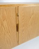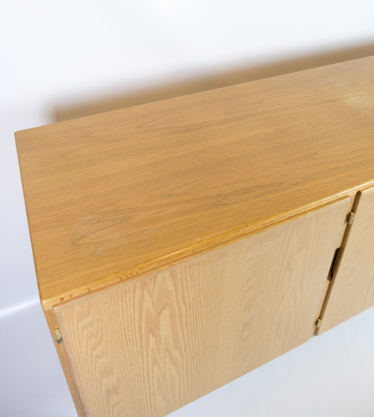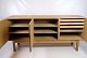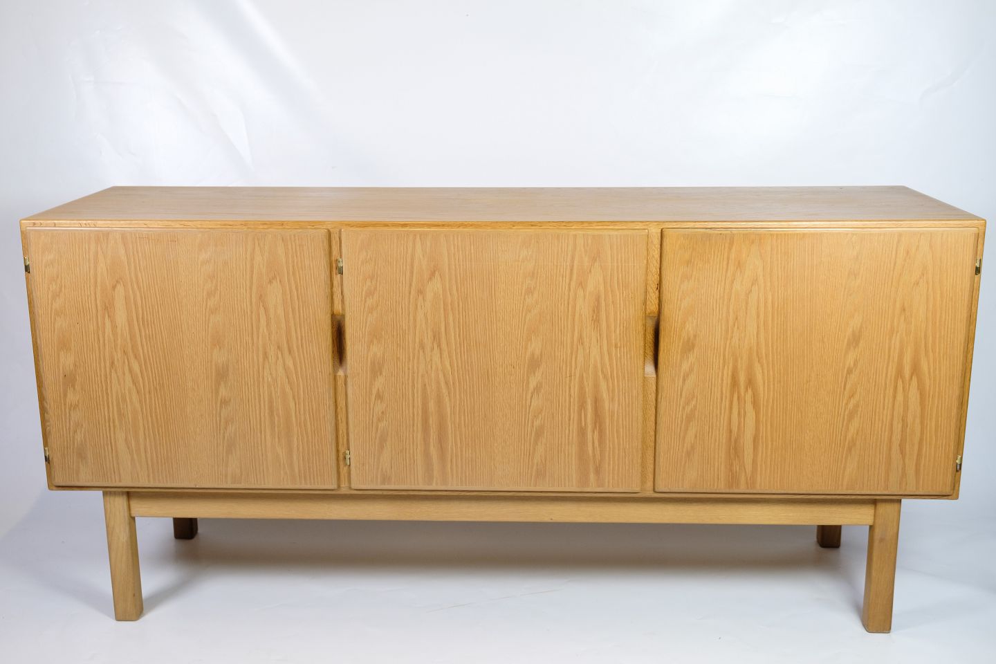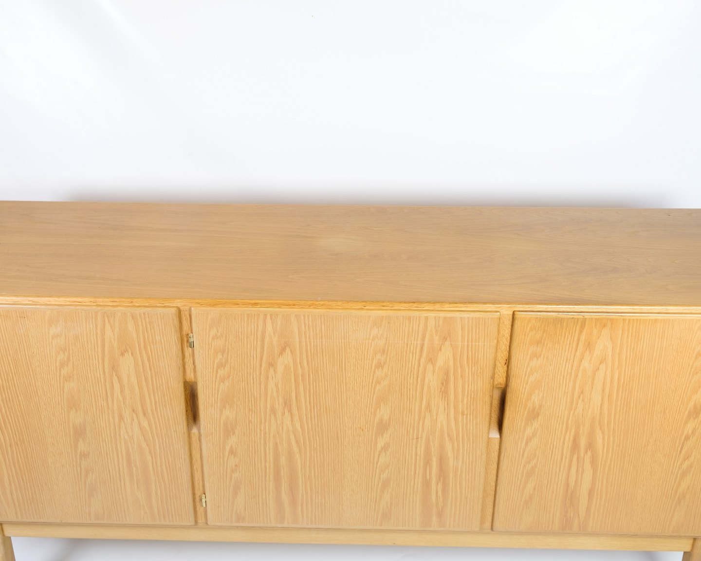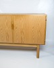 Sideboard in light oak from the 1960s, made in Danish design. The sideboard has three doors that open up to spacious storage compartments with shelves and three pull-out drawers, ideal for storing smaller items. The simple and functional design combines clean lines with quality materials, making the sideboard both practical and stylish.