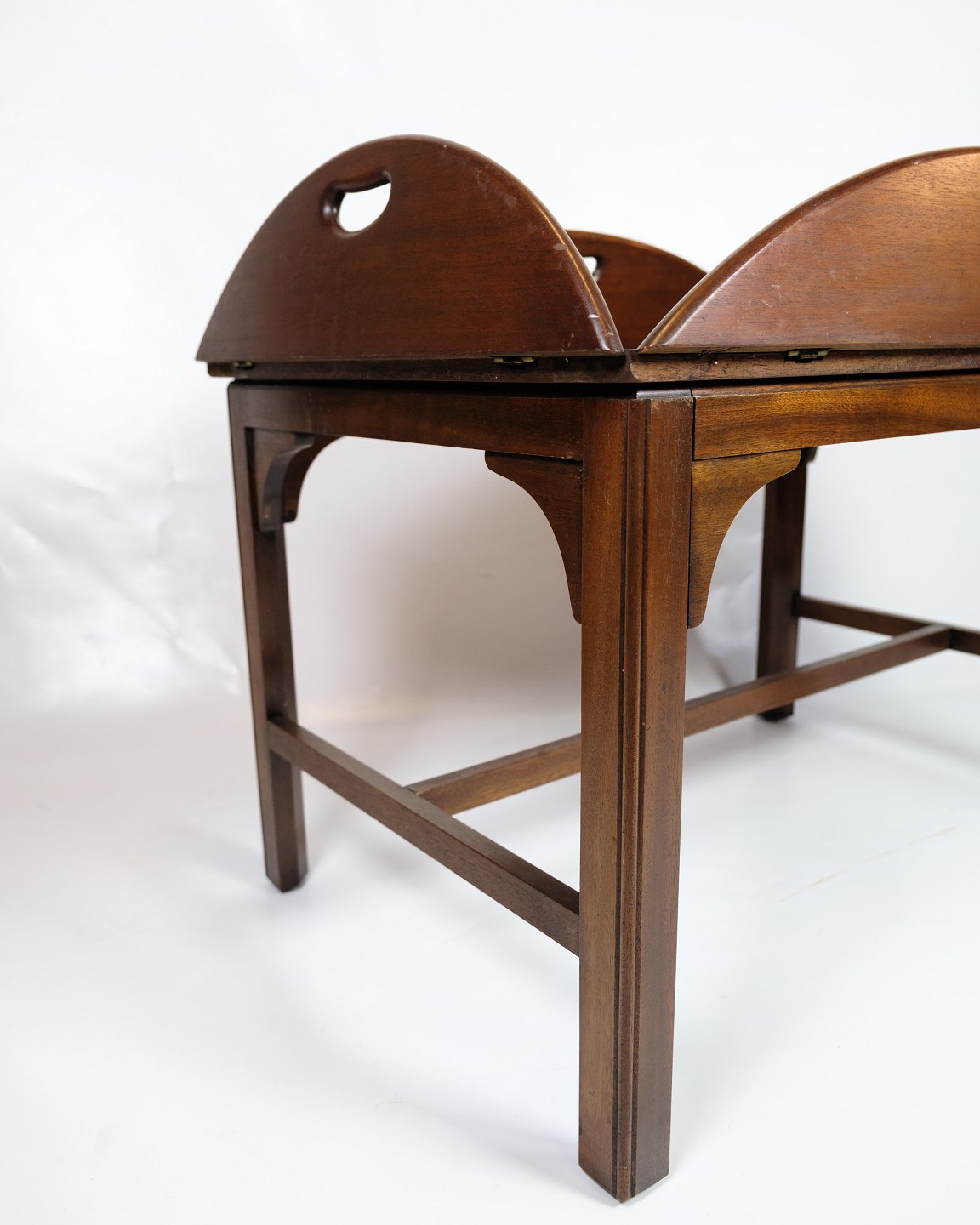 Butlerbord lavet af mahogni fra 1960erne. Bordet er lavet af solid mahogni, hvilket giver det en varm glød og holdbarhed. Butlerborde var populære i denne periode på grund af deres alsidighed – de kan nemt bruges som serveringsbord eller sidebord og har ofte en aftagelig bakke eller håndtag, der gør dem lette at flytte rundt.