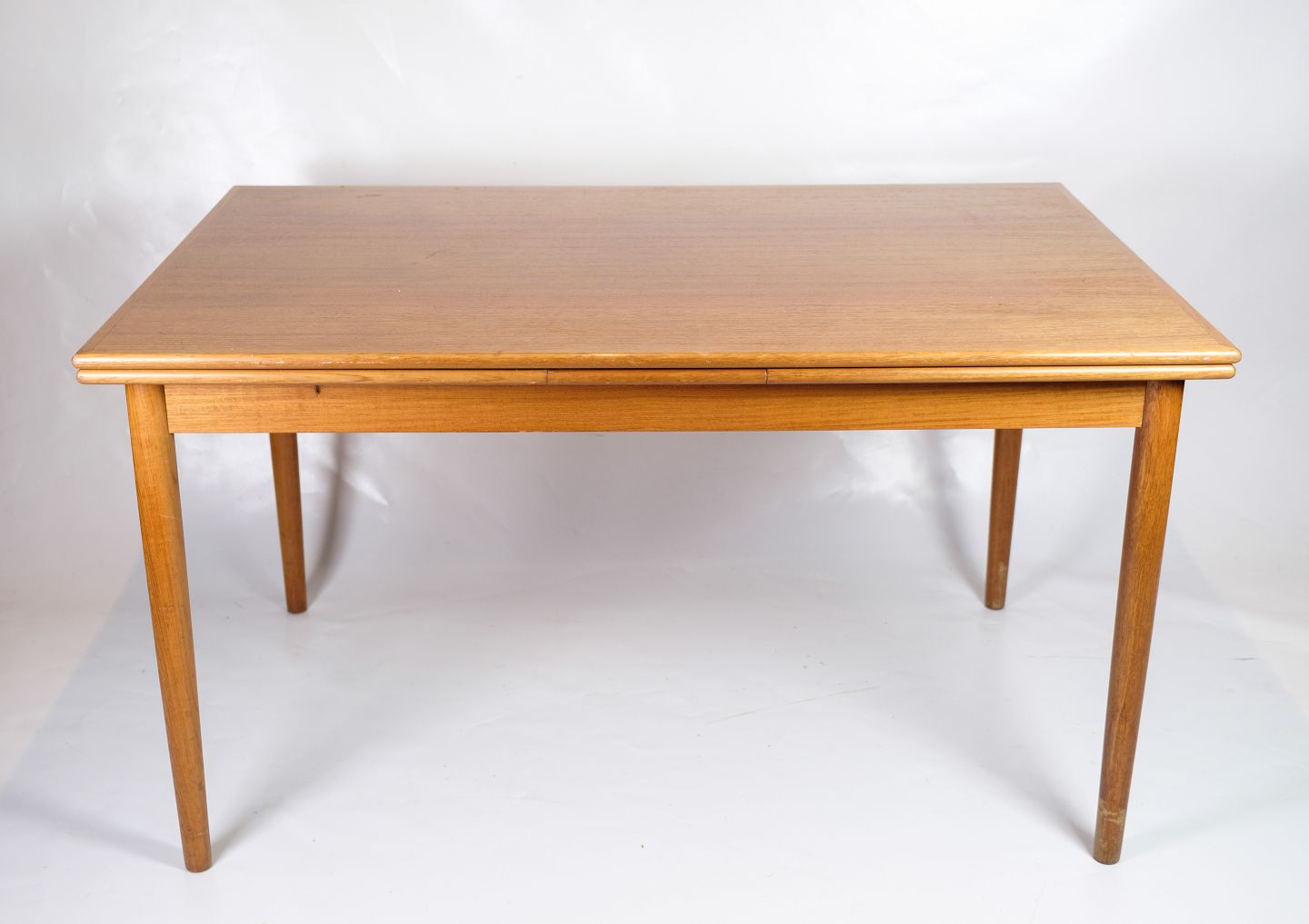 Spisebord med udtræk fra 1960'erne, udført i teak og dansk design. Bordet er designet med rene linjer og en robust konstruktion, typisk for perioden. Det har en udtræksfunktion, der giver mulighed for at tilføje ekstra plader og dermed forlænge bordet, hvilket gør det praktisk til både daglig brug og større sammenkomster.