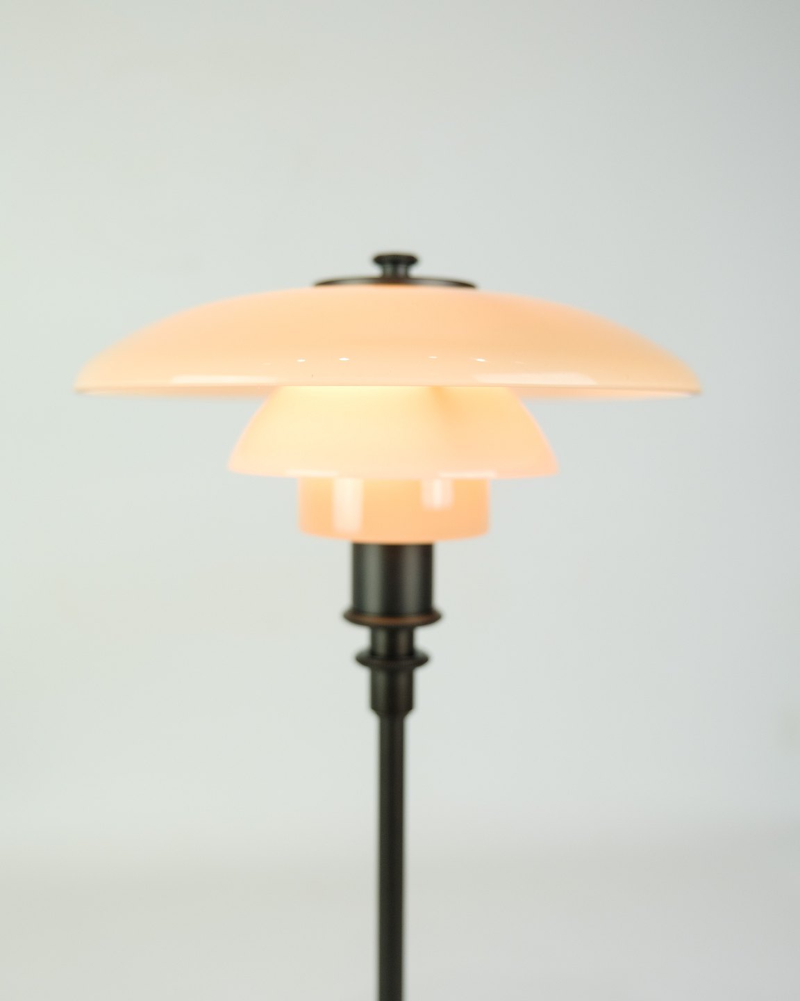 Hver lampe er unik på grund af de håndlavede skærme, der kan variere i nuance og tekstur. Denne model er en hyldest til Henningsens banebrydende treskærmssystem fra 1925-26, designet til at skabe blændfrit og behageligt lys. PH 2/1 bordlampen er ideel til at tilføre eksklusivitet og elegance til ethvert rum.