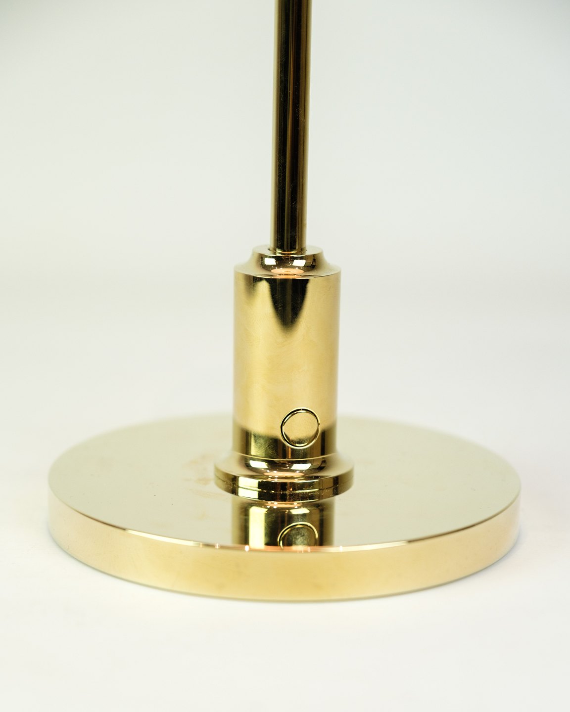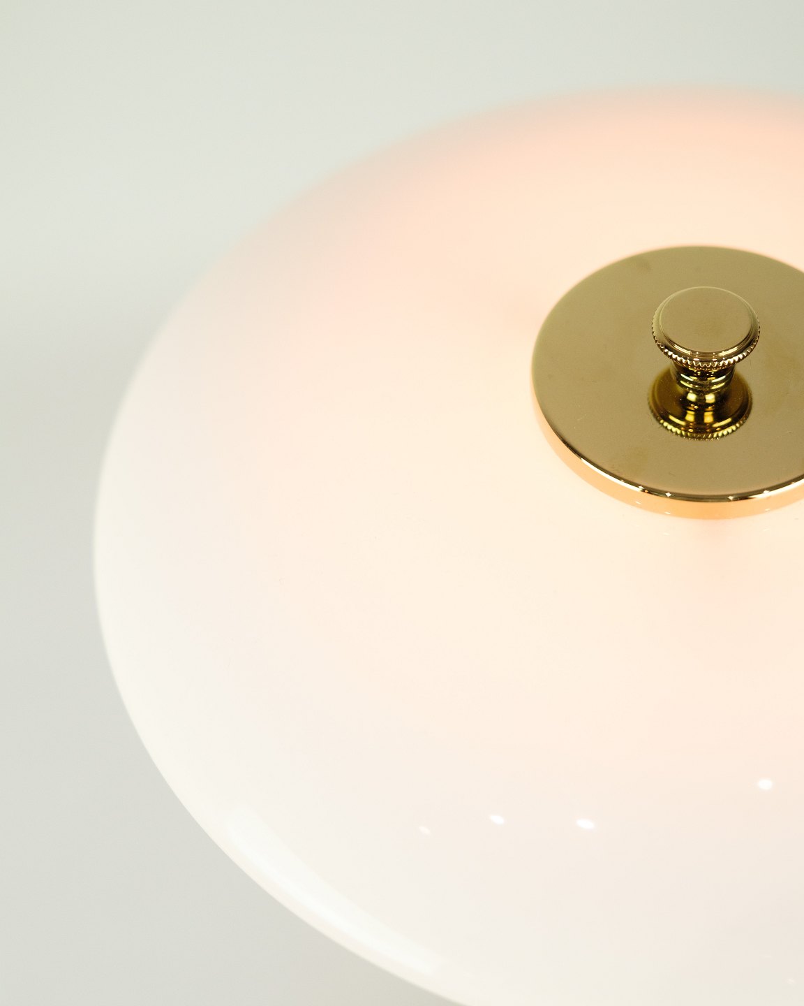Lampen er udstyret med mundblæste opalglas-skærme, der sikrer en blød og behagelig lysfordeling. Det eksklusive messingstel tilfører en elegant og tidløs æstetik, som passer perfekt til både moderne og klassiske indretninger.