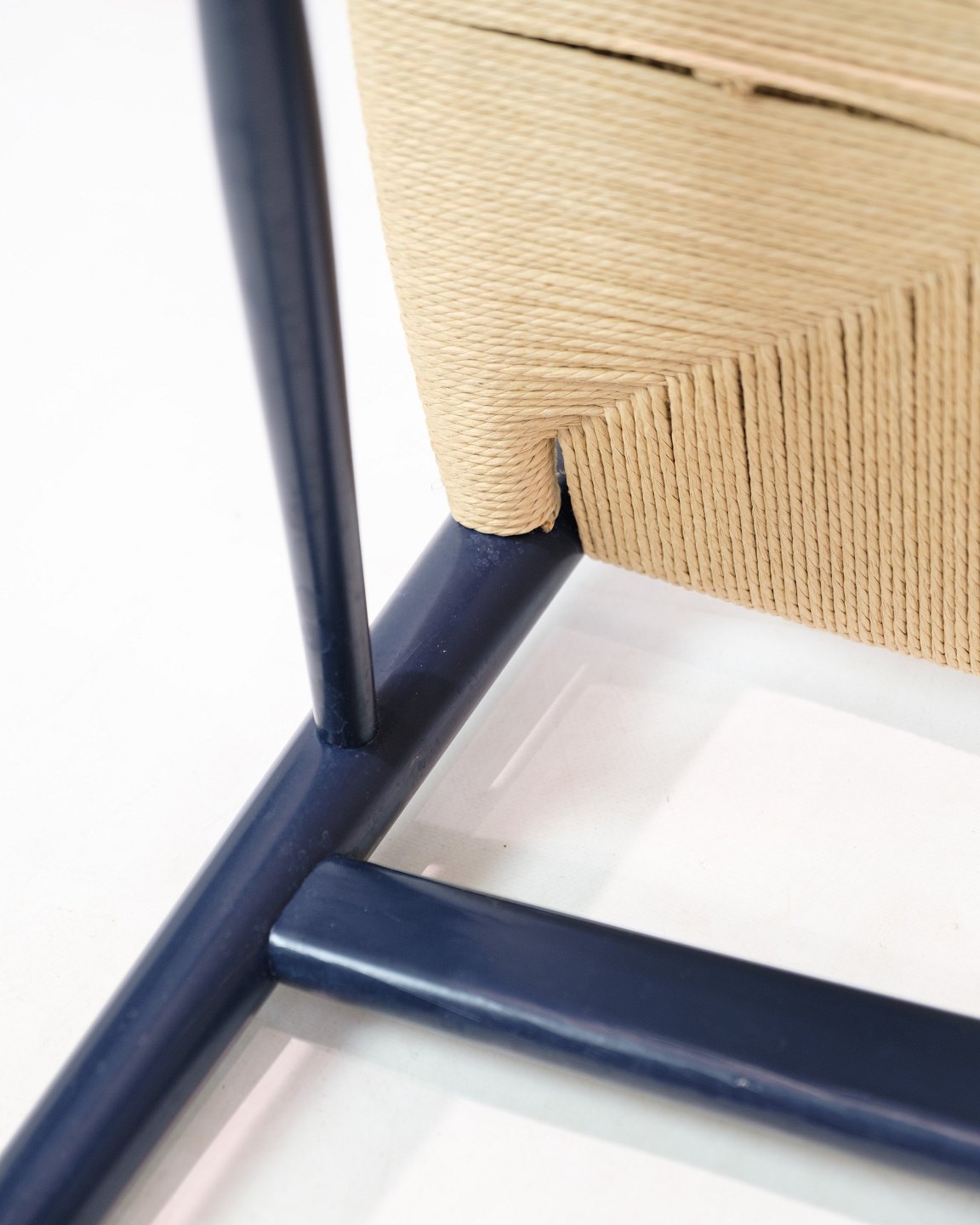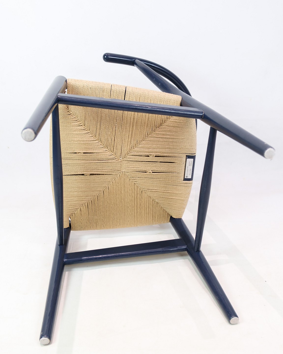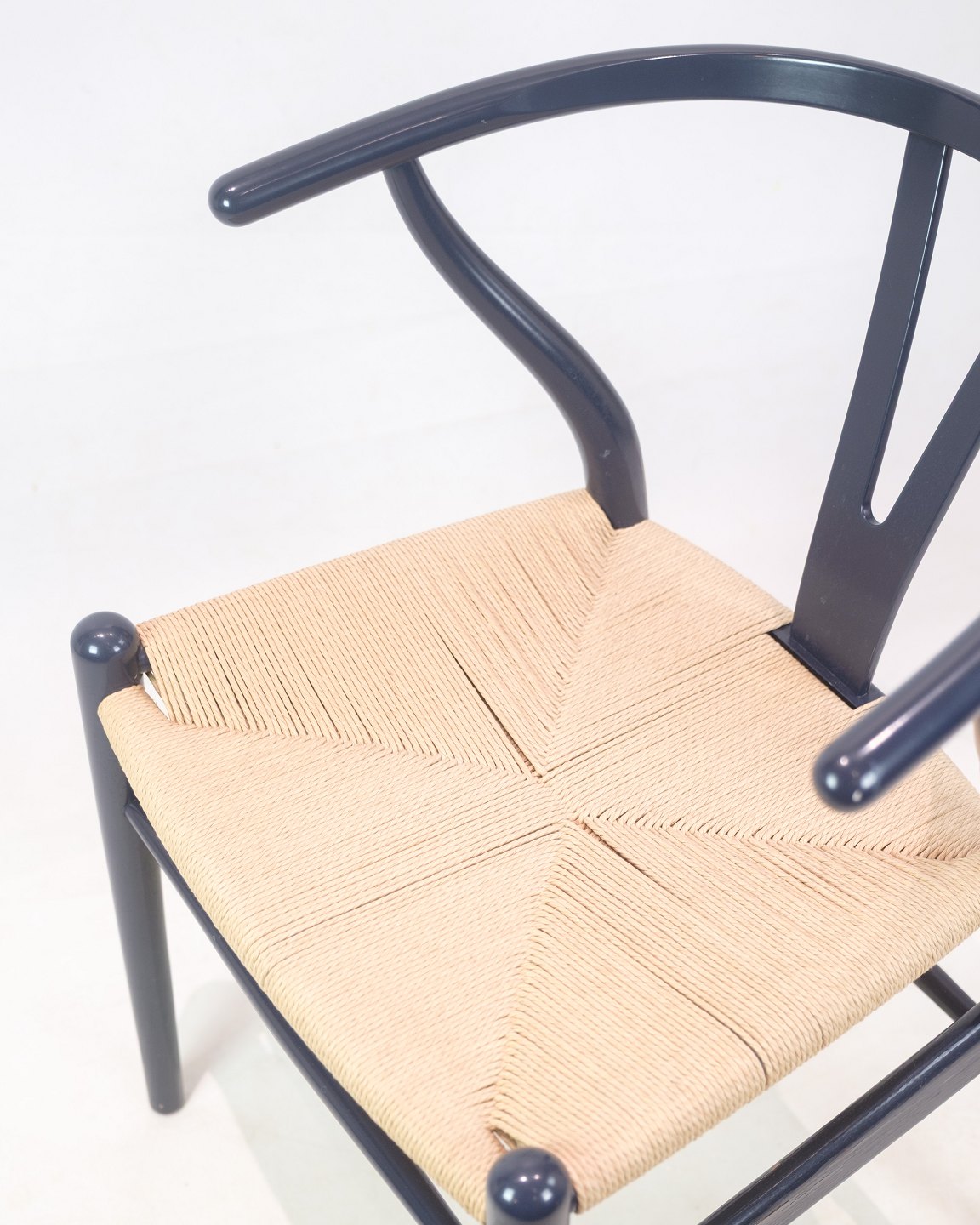 SolgtSæt af 4 Y-stole, model CH24, Designet af Hans J. Wegner og produceret af Carl Hansen & Søn. Stolene er malet i en navy blå farve og sædet er udført i det klassiske naturflet.