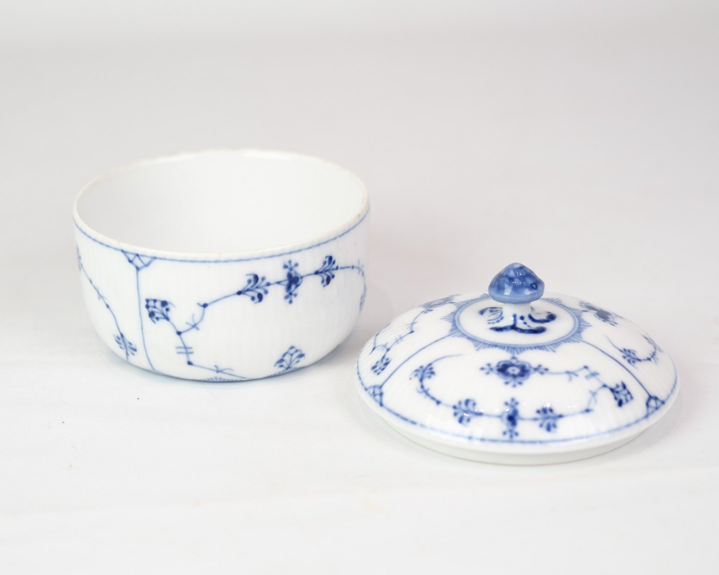 Sjælden skål med låg mærket 1/240 designet af Arnold Krog og fremstillet af Royal Copenhagen. Lavet i porcelæn med musselmalet riflet design. Håndmalet i blå dekoration.