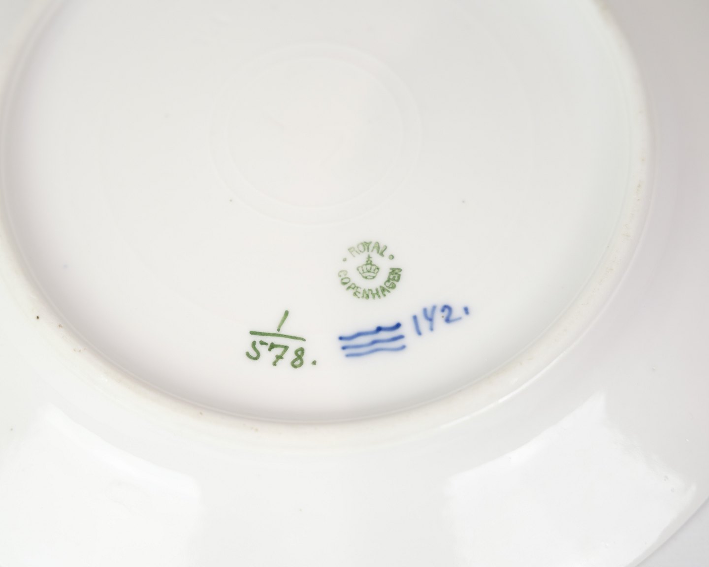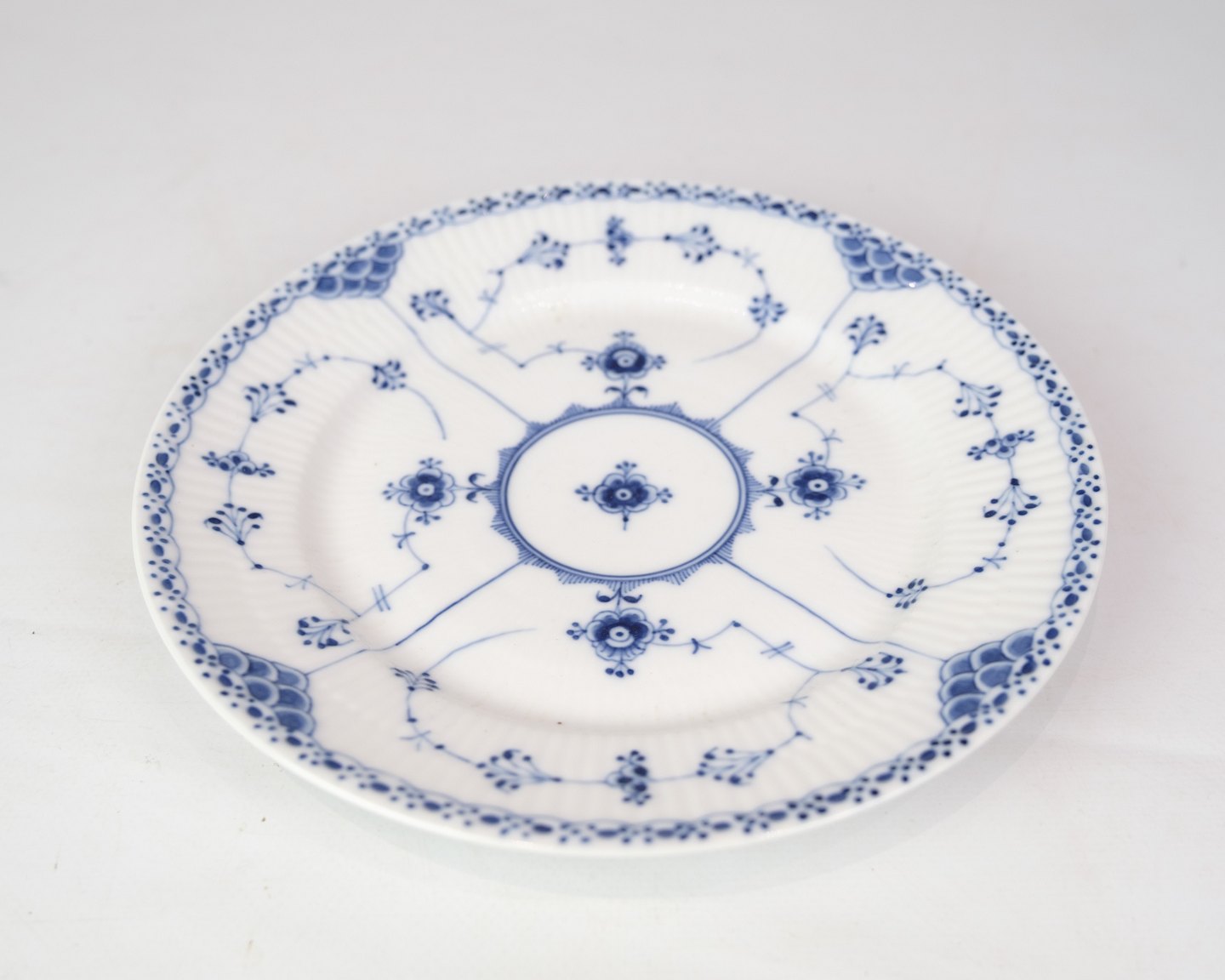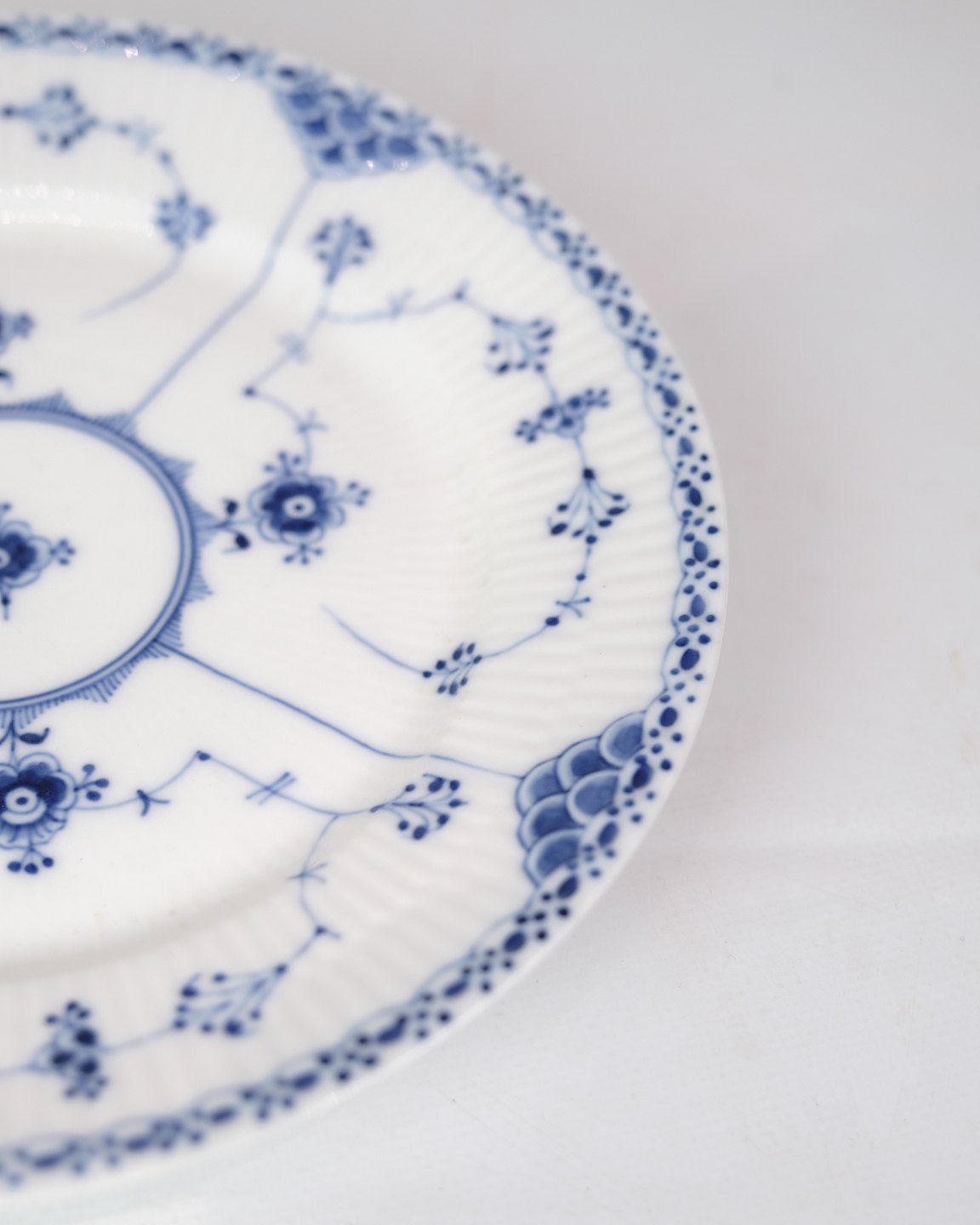 SoldLunch plate marked 1/578 from Royal Copenhagen. Made of porcelain with blue-fluted half-lace design, plate is hand-painted in blue decoration.