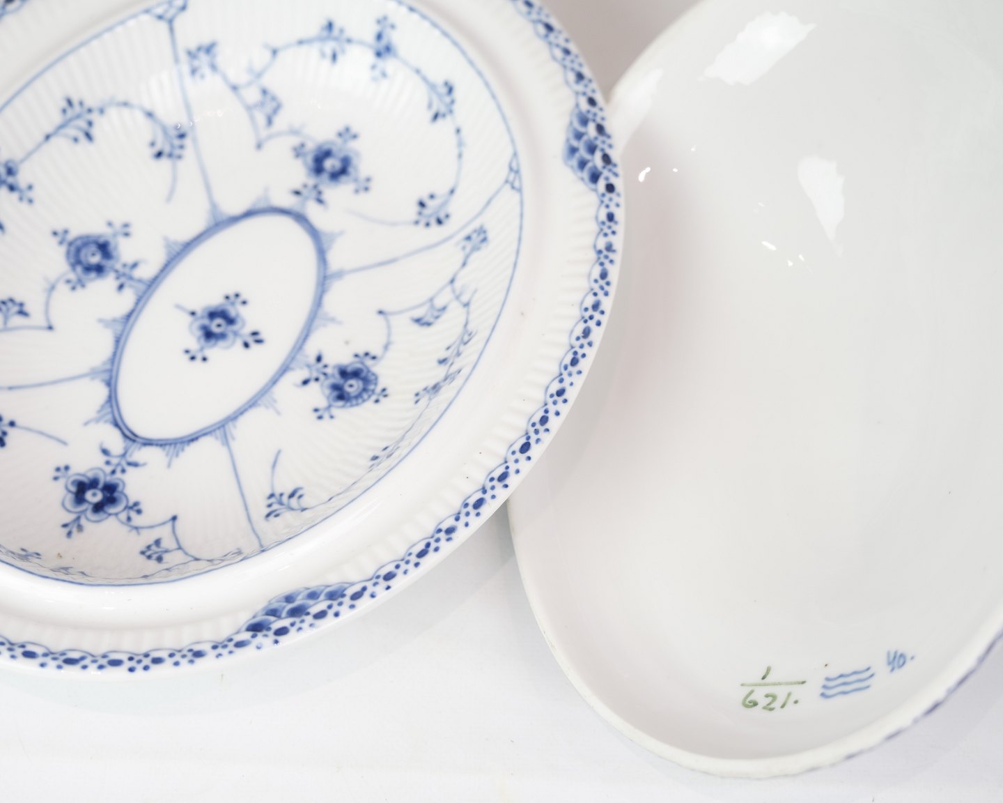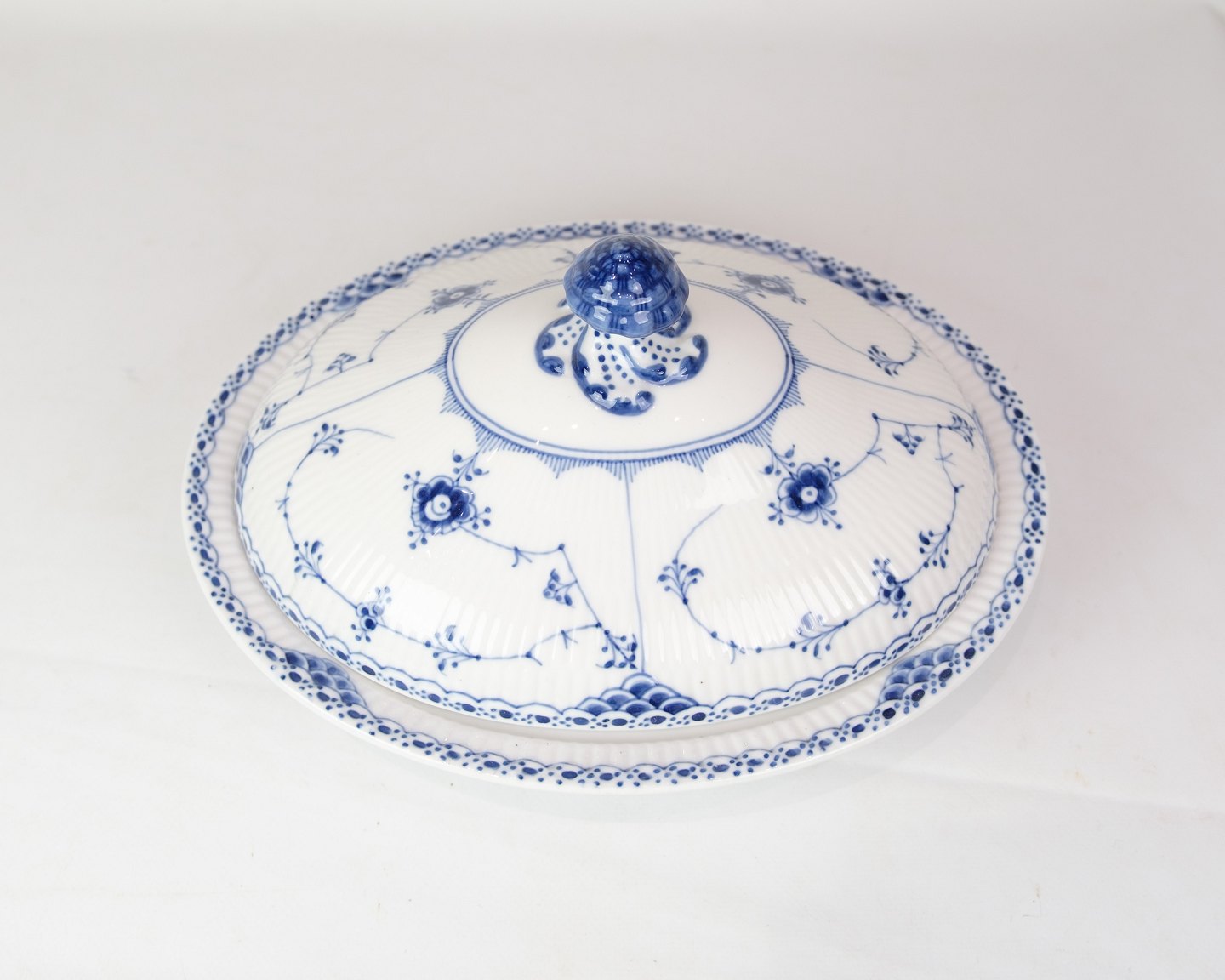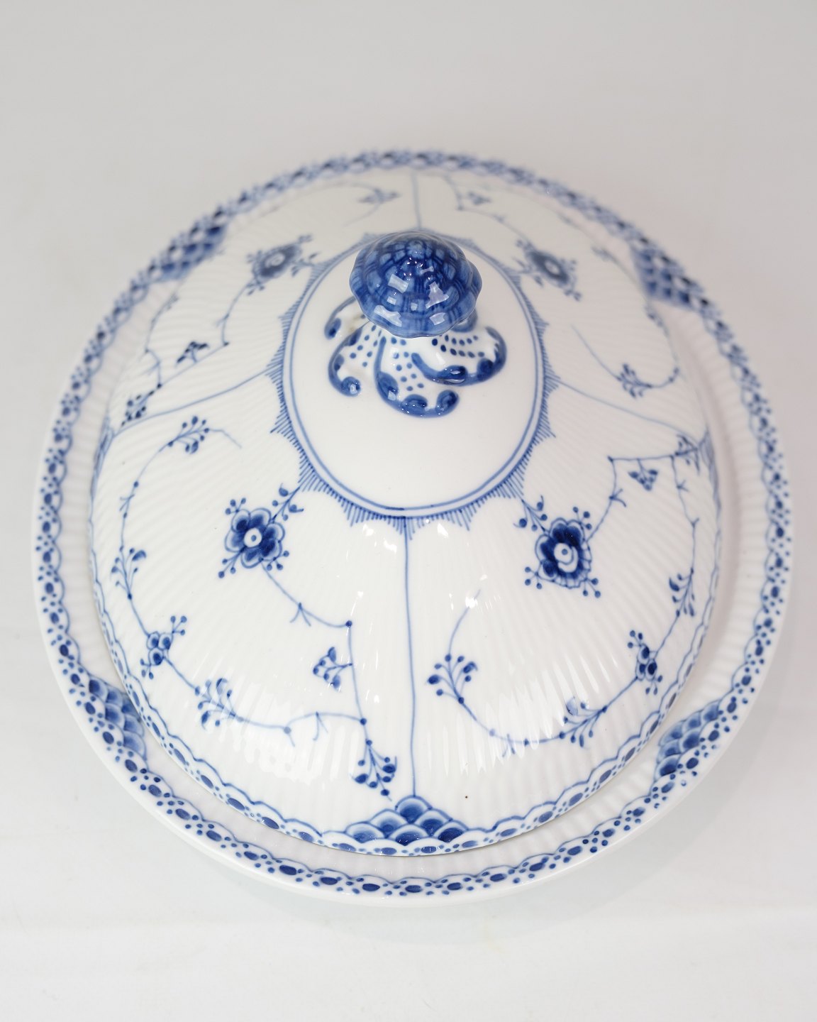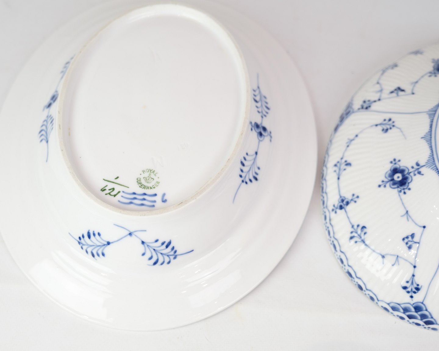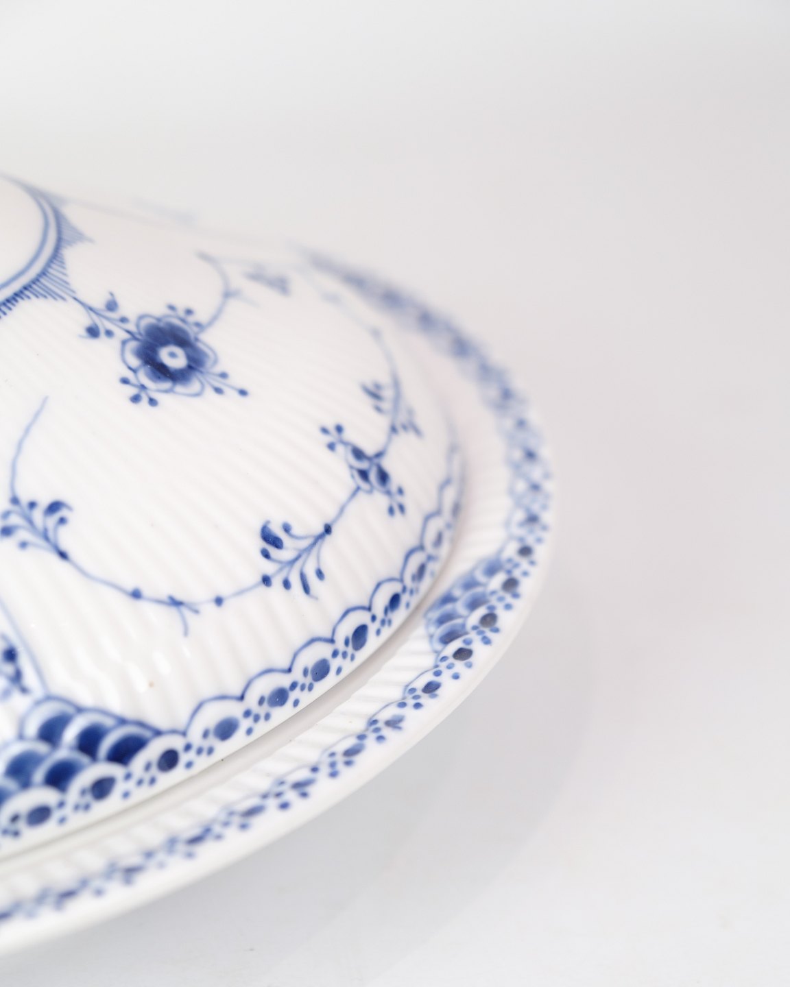 SoldRoyal Blue Fluted Half Lace Lidded Dish marked 1/621 from Royal Copenhagen. Made of porcelain, hand-painted blue decoration.