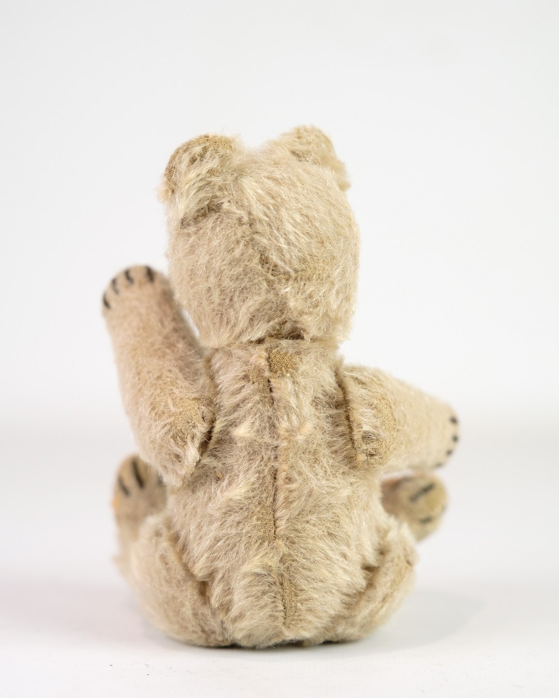 Old teddy bear in beige mohair. The teddy bear has black glass eyes, an embroidered nose and paws with sewn details. The feet show clear signs of use and patina. A nice little collector's teddy bear with an authentic expression.