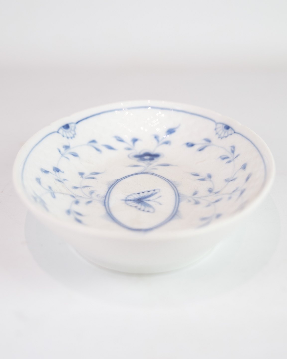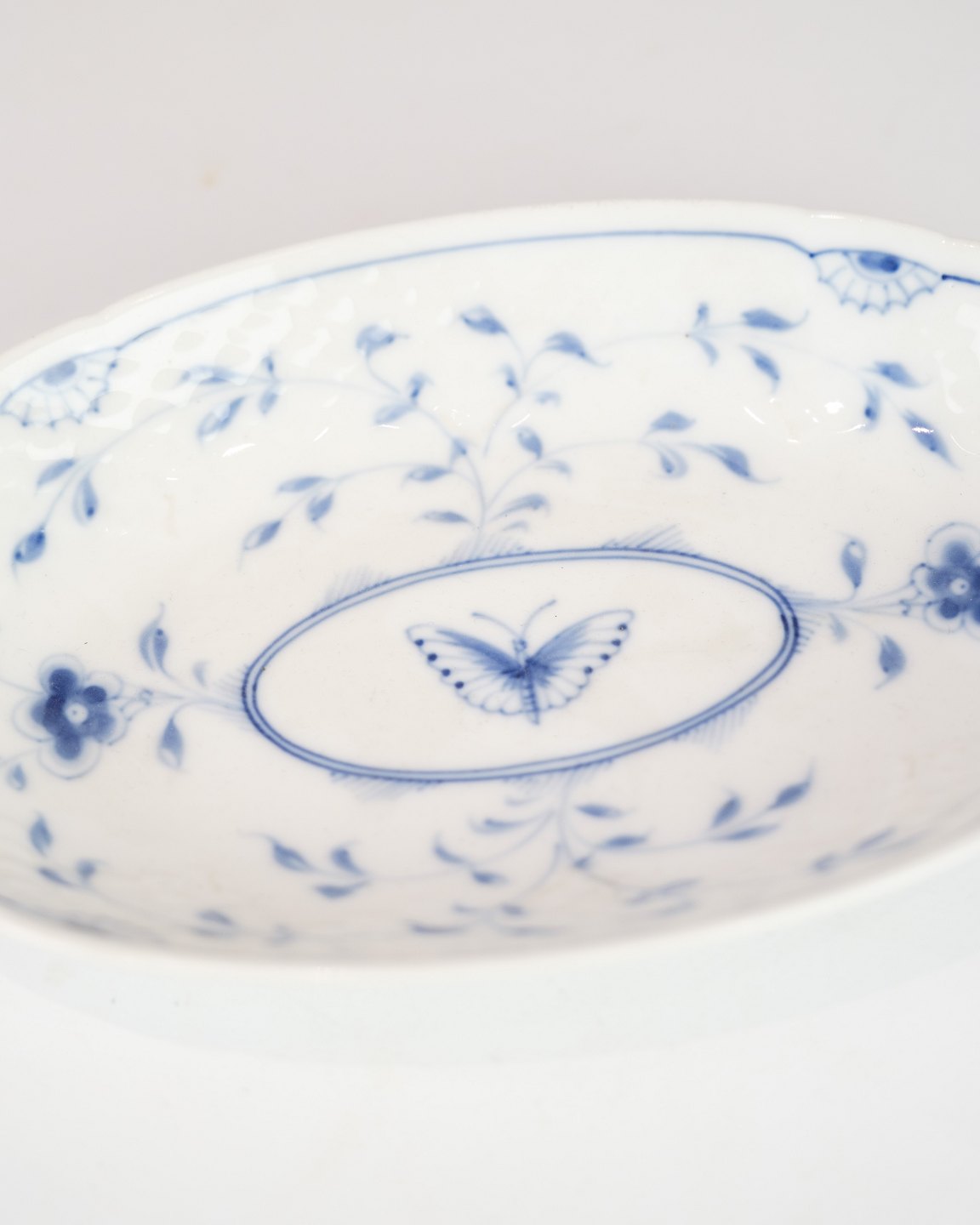 Ovalt fad nr. 39 fra Bing & Grøndahl, udført i porcelæn med håndmalet sommerfuglmotiv. Et klassisk serveringsfad med originalt stempel under bunden.