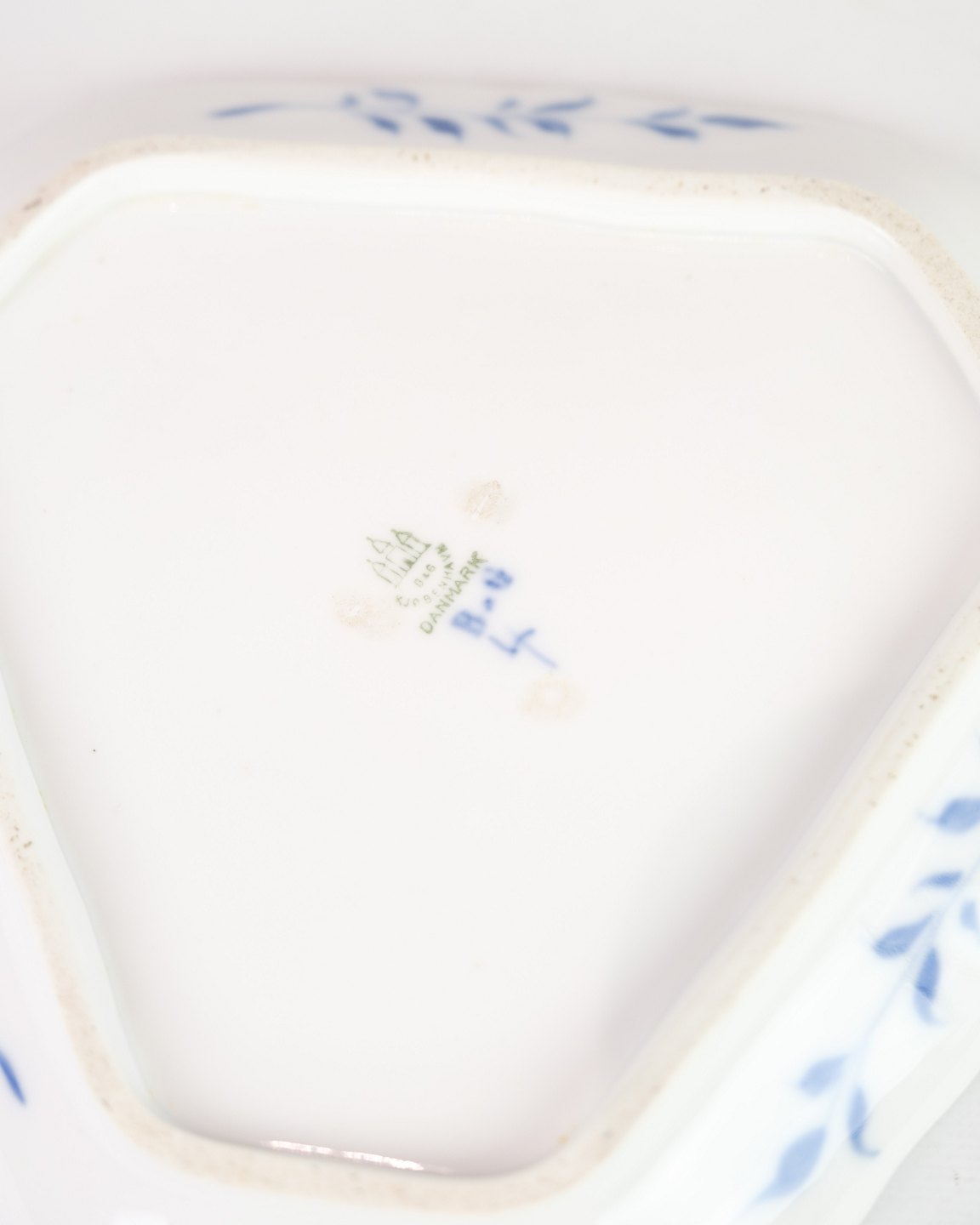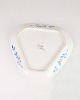Trekantet fad nr. 4 fra Bing & Grøndahl. Udført i porcelæn med håndmalet sommerfuglmotiv. Unik form, velegnet til servering eller som dekorativt element. Stemplet under bunden.