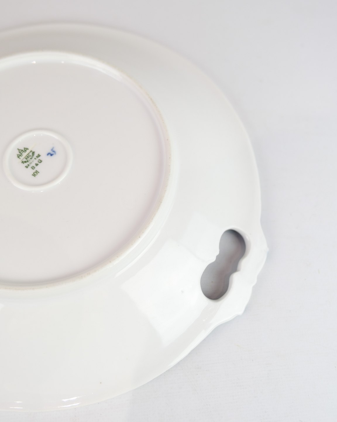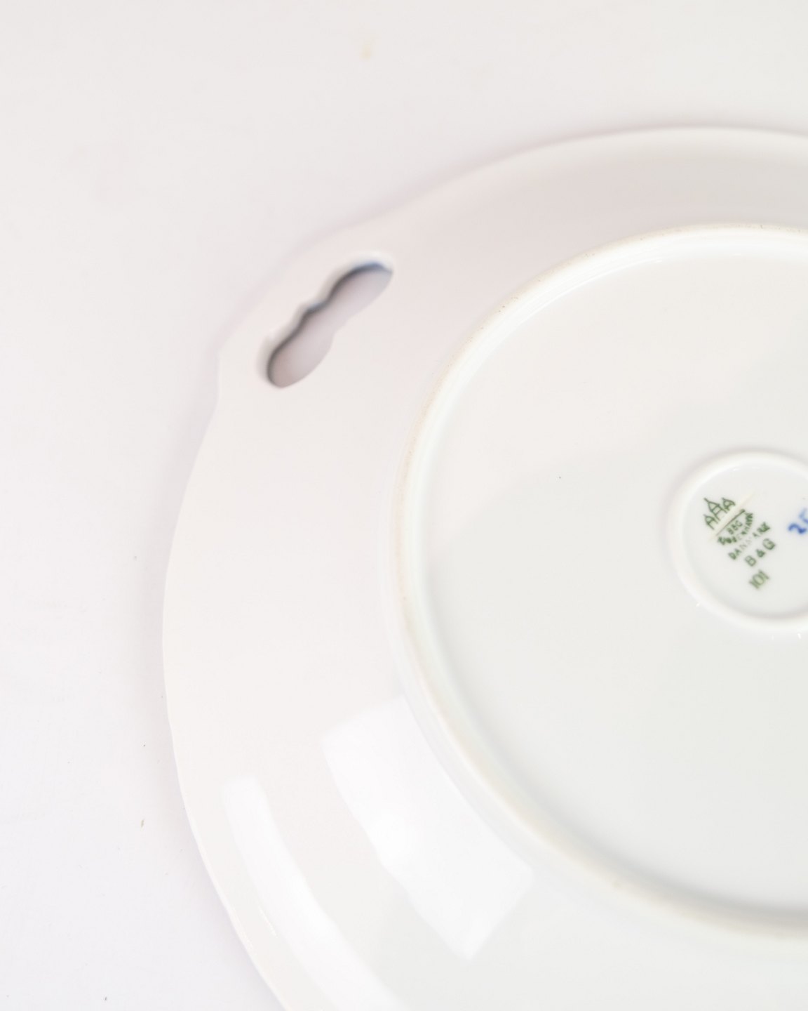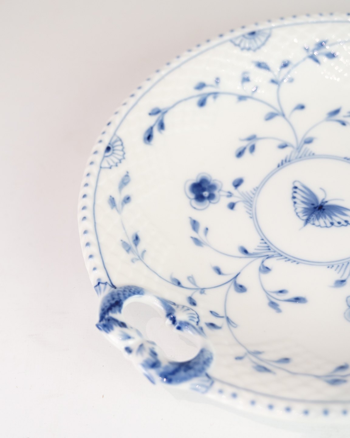 Rundt kagefad med hanke, model nr. 101, Designet af Frederik August Hallin fra Bing & Grøndahl. Dekoreret med Sommerfugl-motiv. Porcelæn med trykt stempel under bunden. Egnet til servering eller samling.