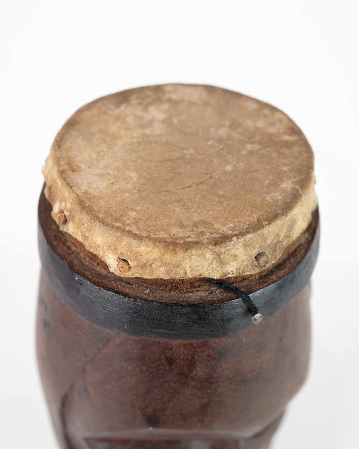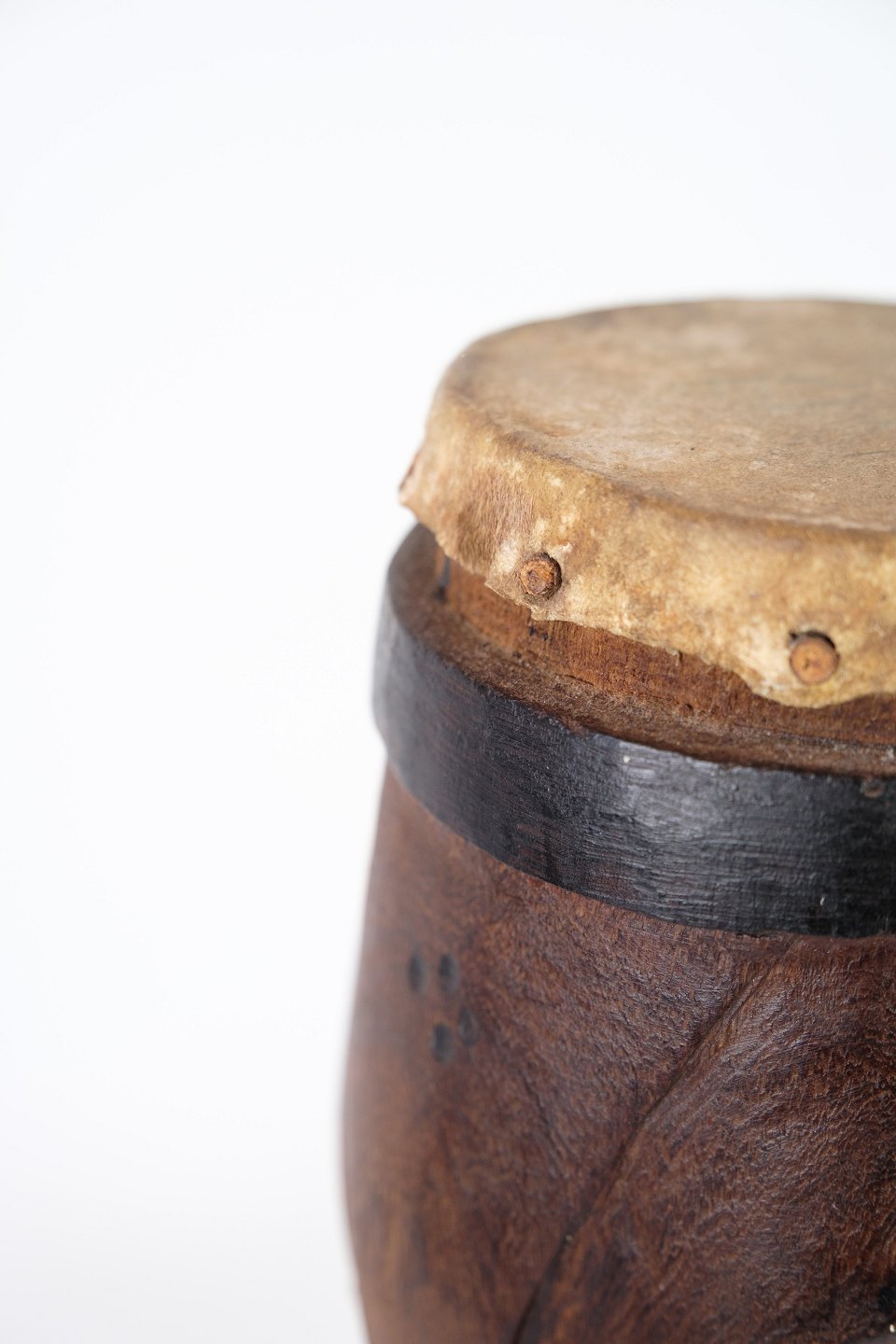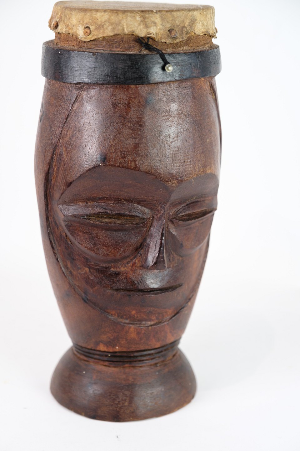 Hand carved African drum from West Africa with a face design. Made of wood with original hide and leather details.