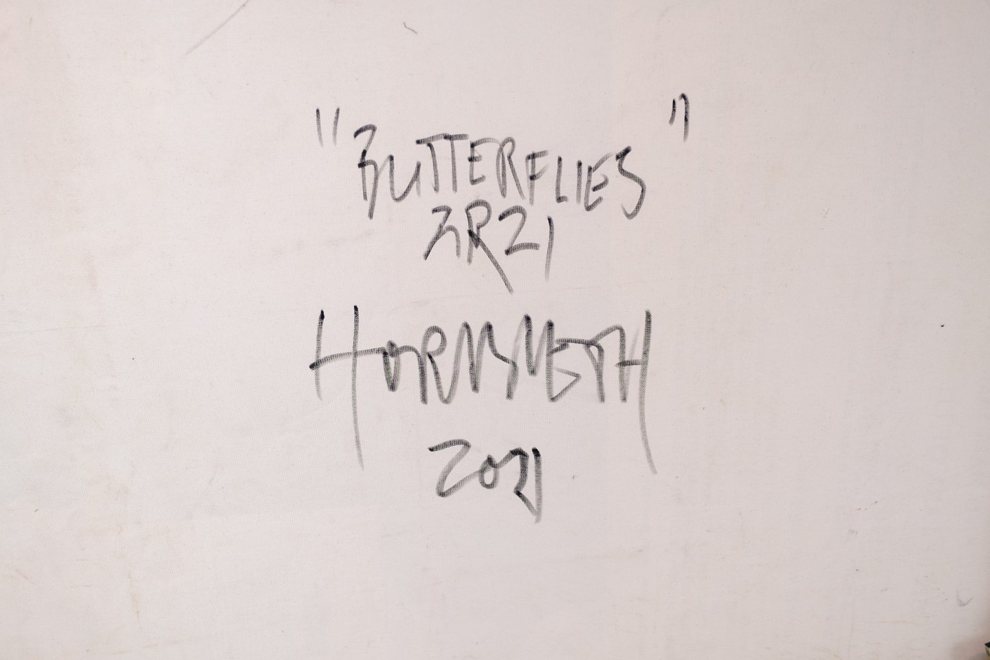 Originalt maleri af Kristian von Hornsleth i mixed media på lærred fra 2021 med titlen "Butterflies ART". Maleriet måler ca. 106 x 140 cm og er et karakteristisk eksempel på Hornsleths farverige og energiske stil. Værket er domineret af sommerfuglemotiver i lag på lag af kraftige penselstrøg, dryp og kontrastfulde farver, med det ikoniske "HORNSLETH"-navn centralt placeret.