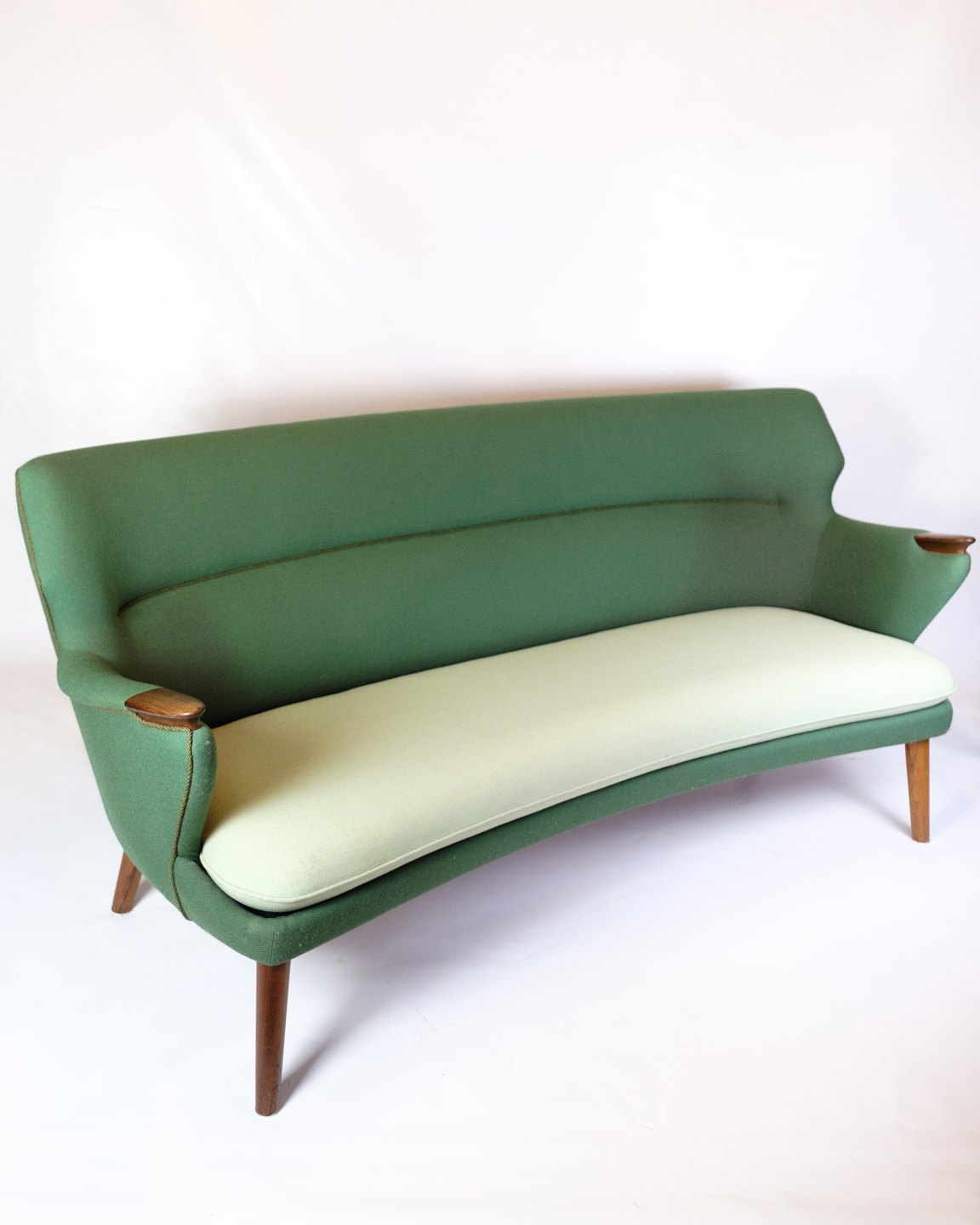 Green Sofa model 220, with light cushion cover by the Danish furniture architect Kurt Olsen. The sofa was made in the 1960s with high quality fabric with "nails" and legs of solid rosewood. The sofa appears in fine used condition with wear and tear.