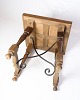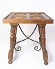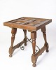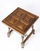 Sidebord i mørkt træ med paneleret bordplade i geometrisk mønster. Bordet står på drejede ben, der er forbundet med svungne metalstivere for ekstra stabilitet.