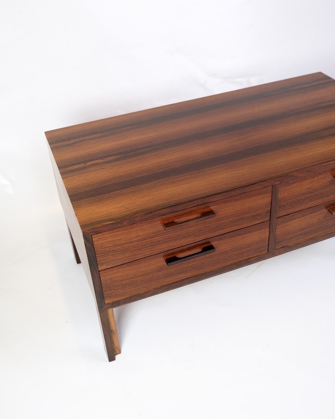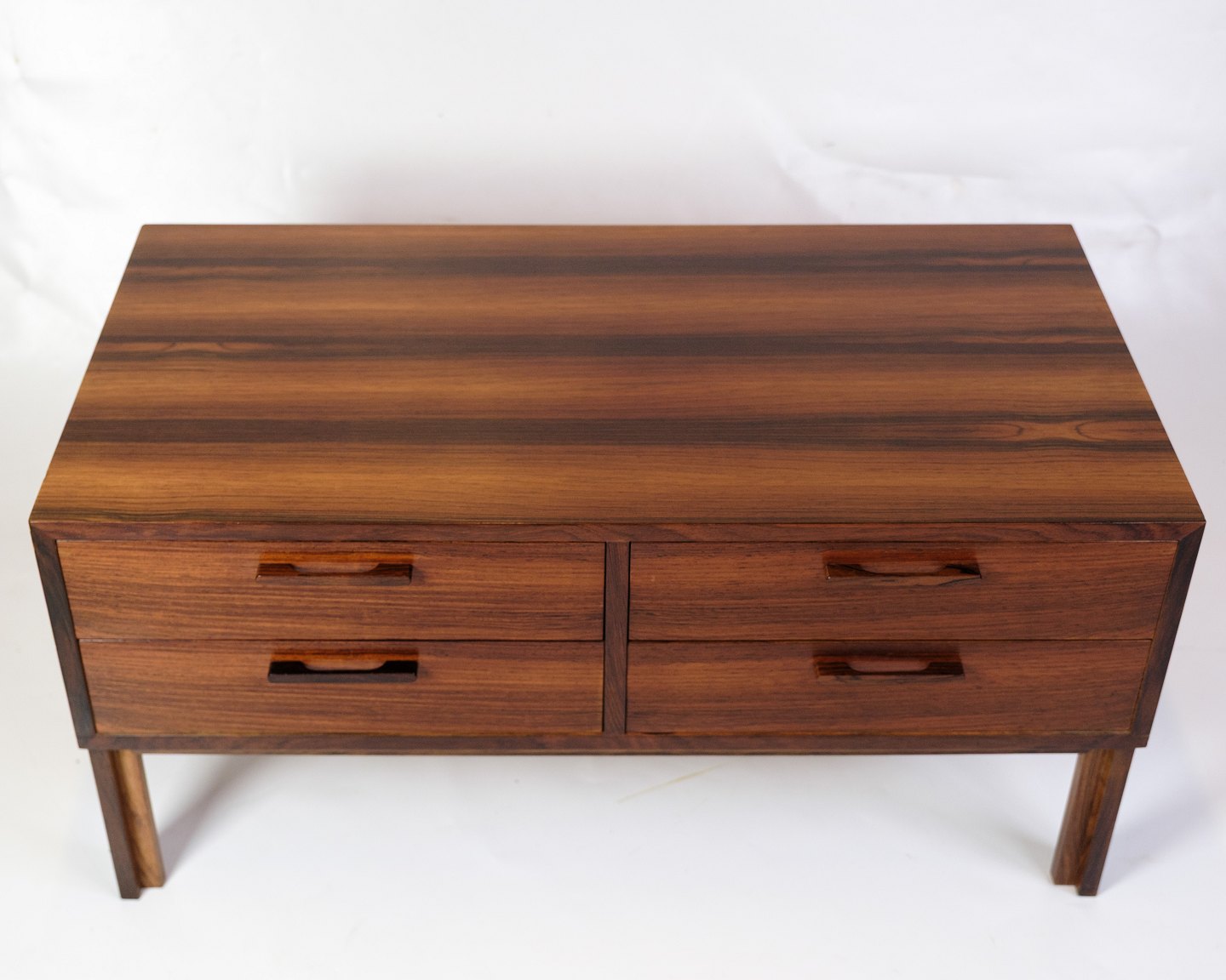 SolgtLille kommode i palisander med fire skuffer, ideel til opbevaring i stue, soveværelse eller kontor. Kommoden er fra ca. 1960’erne og repræsenterer klassisk dansk design med fokus på funktionalitet og naturlige materialer.