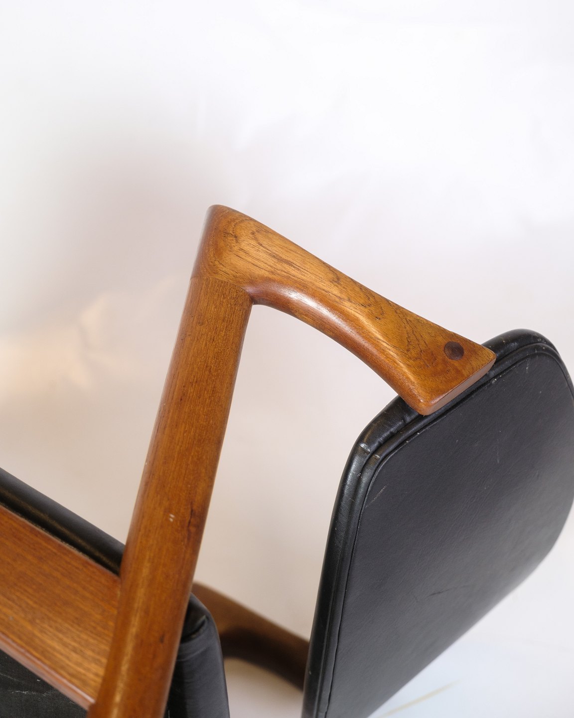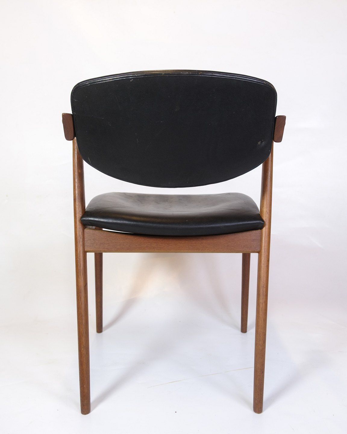 Model 42 is a dining chair designed by Kai Kristiansen and manufactured by Schou Andersen in the 1960s. The chair is made of solid teak with black aniline leather and has a characteristic tilting back that combines comfort with a sharp, light design. A beautiful example of Danish furniture art, where functionality and aesthetics go hand in hand.
