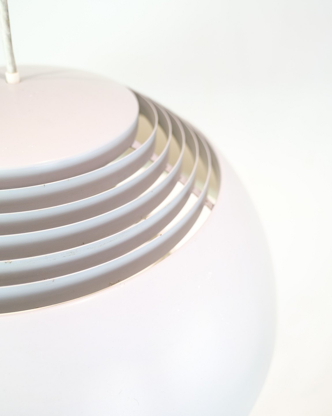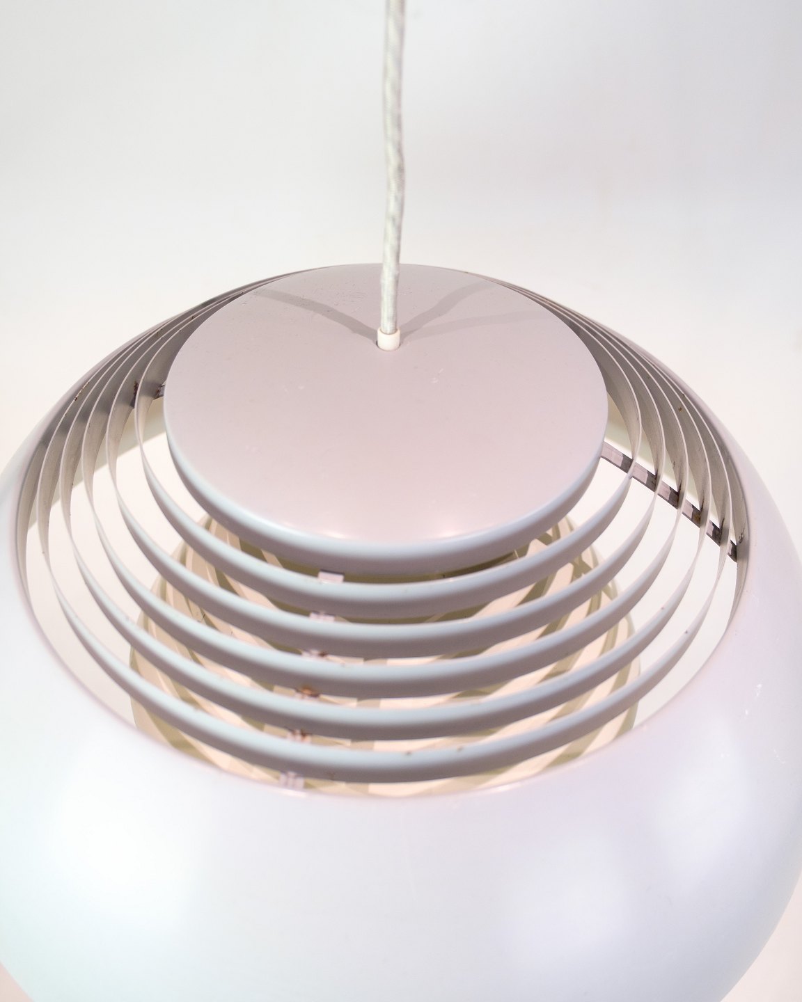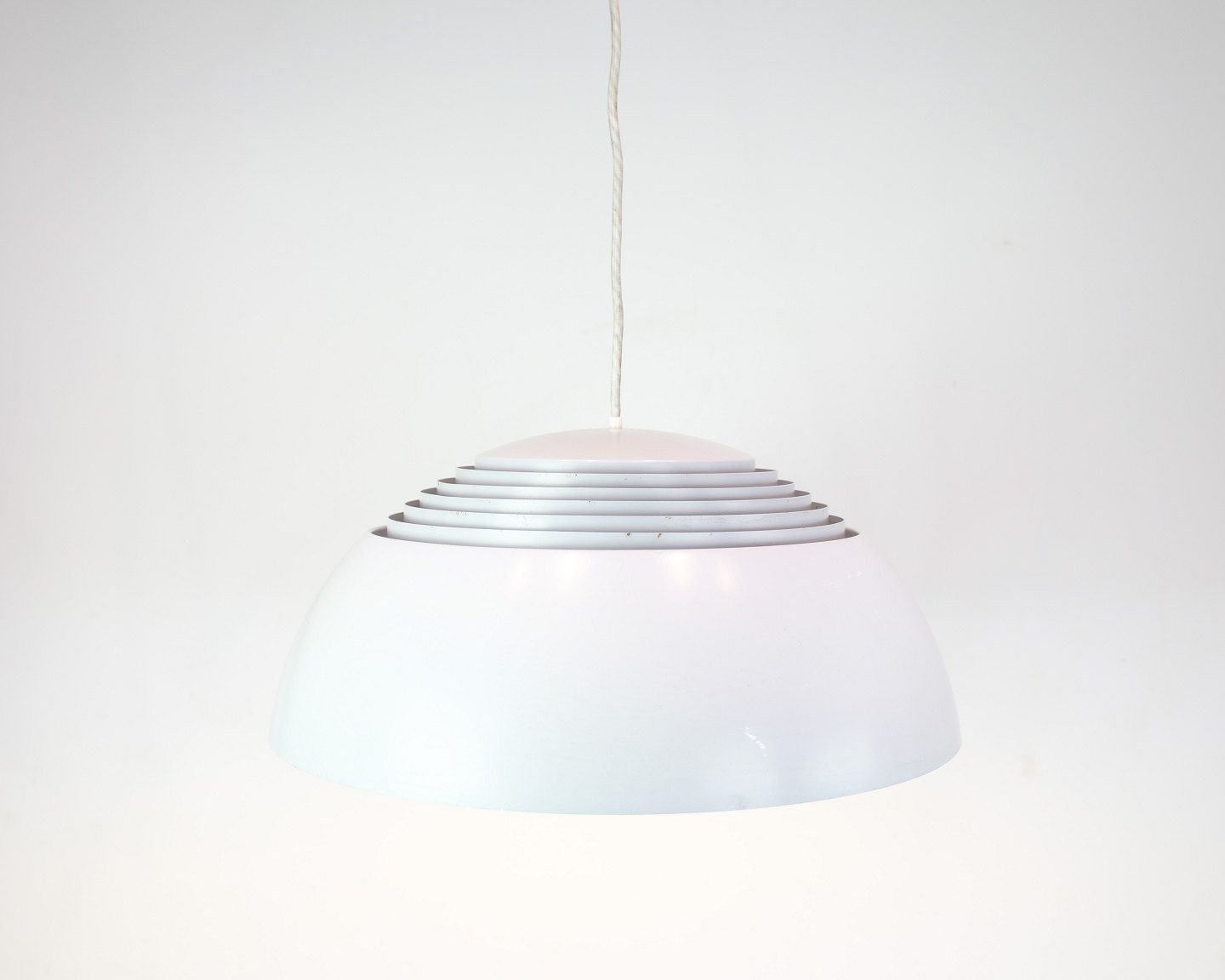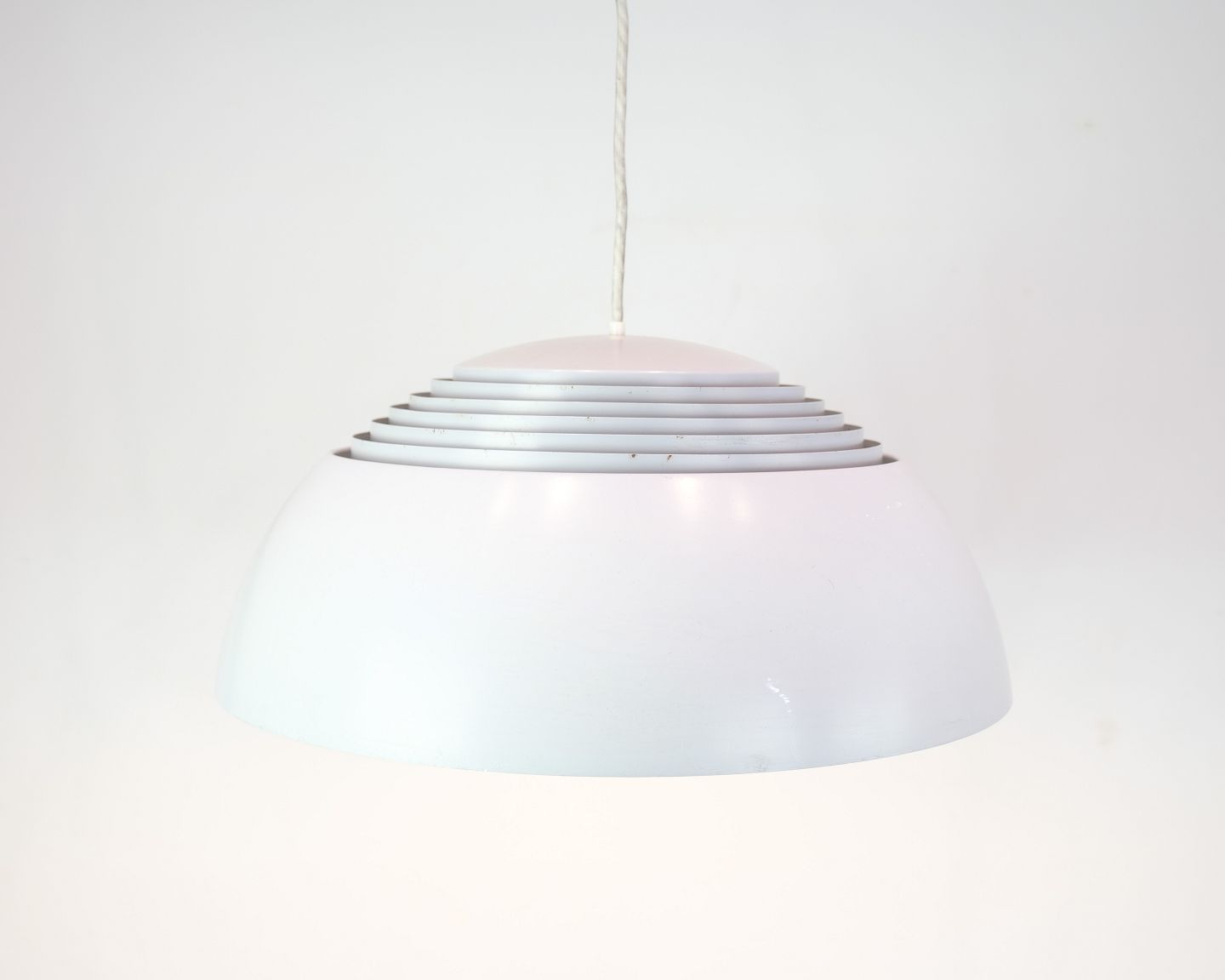 AJ Royal pendlen blev designet af Arne Jacobsen i 1957 som en del af det samlede designkoncept til det daværende SAS Royal Hotel i København. Produktionen blev kort efter sat i gang af Louis Poulsen, som fortsat fremstiller lampen i dag. Denne udgave er i grå med hvid ledning.