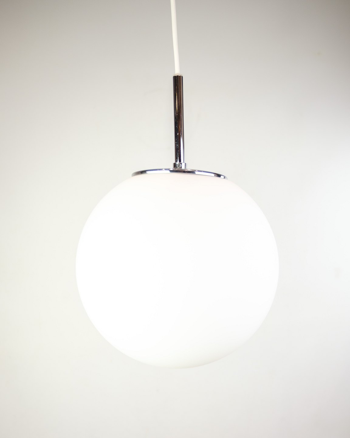 Pendel i kugleformet matteret glas med forkromet ophæng og hvid ledning. Lampen giver et blødt, diffust lys og passer perfekt over spisebord eller til entré. Et minimalistisk stykke skandinavisk design, hvor funktion og form mødes i en rolig helhed.